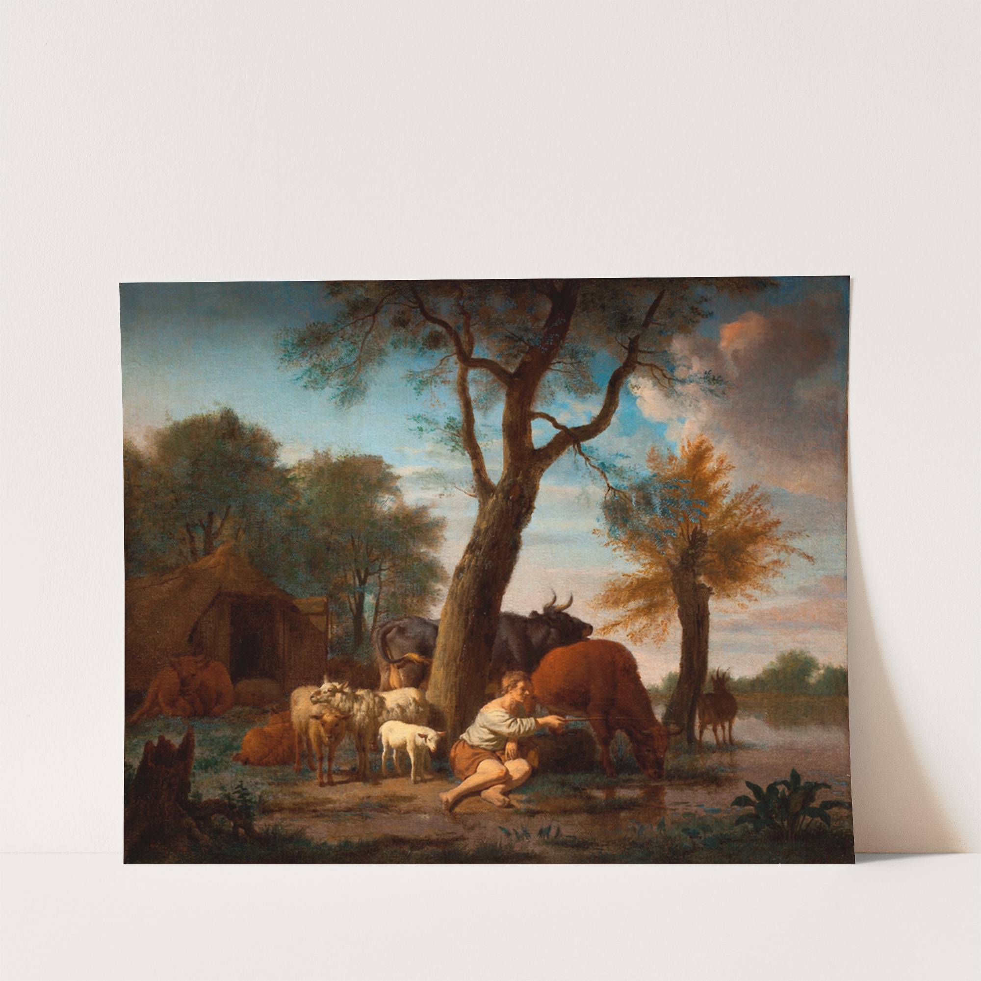 This exquisite art print showcases "The Fishing Herdsman" by Adriaen van de Velde, a masterful piece that blends realism with pastoral charm. Set in a serene woodland clearing, the scene captures an idyllic rural tableau. In the foreground, a man...