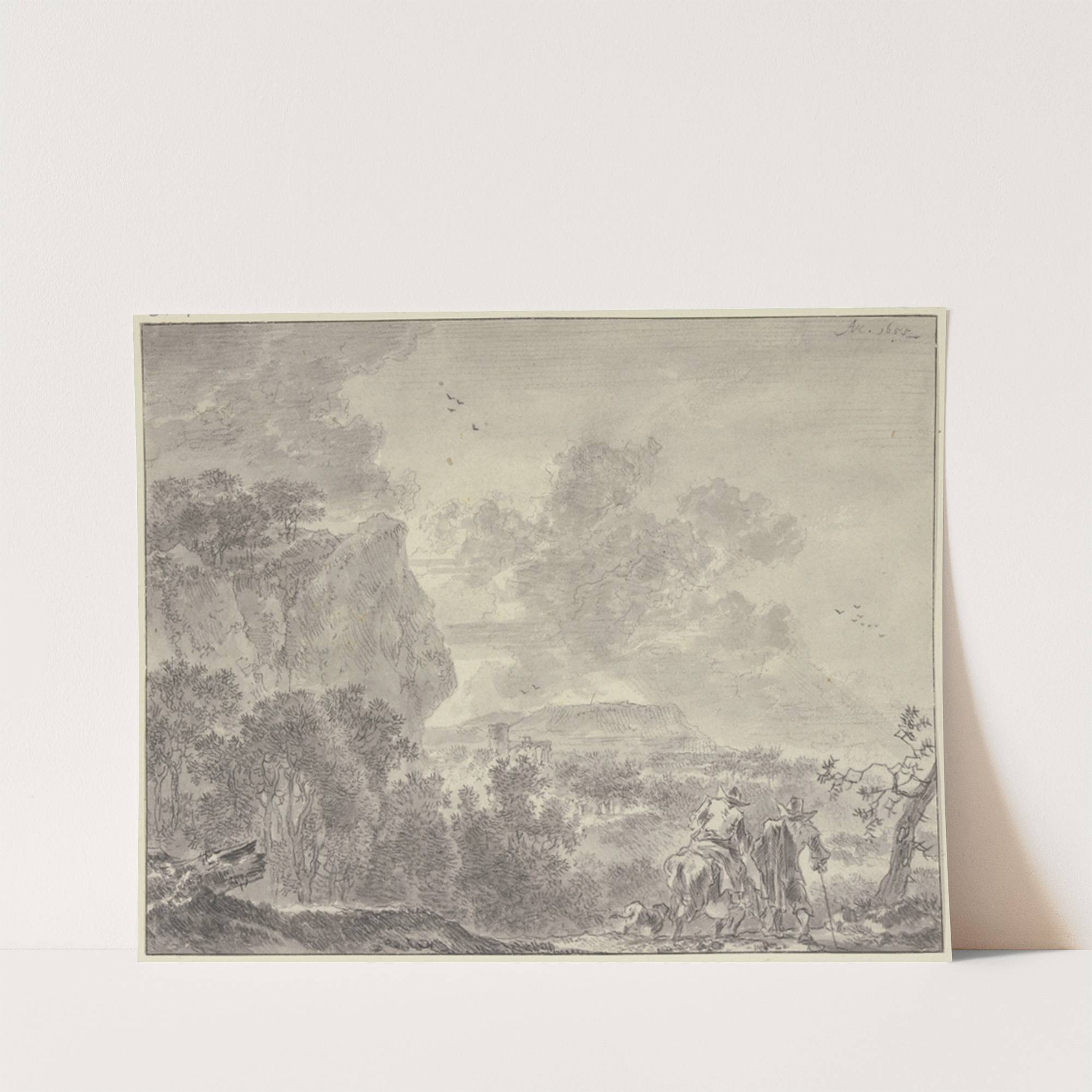 Discover the tranquil beauty of "Italian Landscape" by Adriaen van der Cabel. This exquisite black-and-white etching captures a serene countryside scene with remarkable detail and elegance. The foreground features two riders on horseback, one slightly ahead of the other, suggesting...