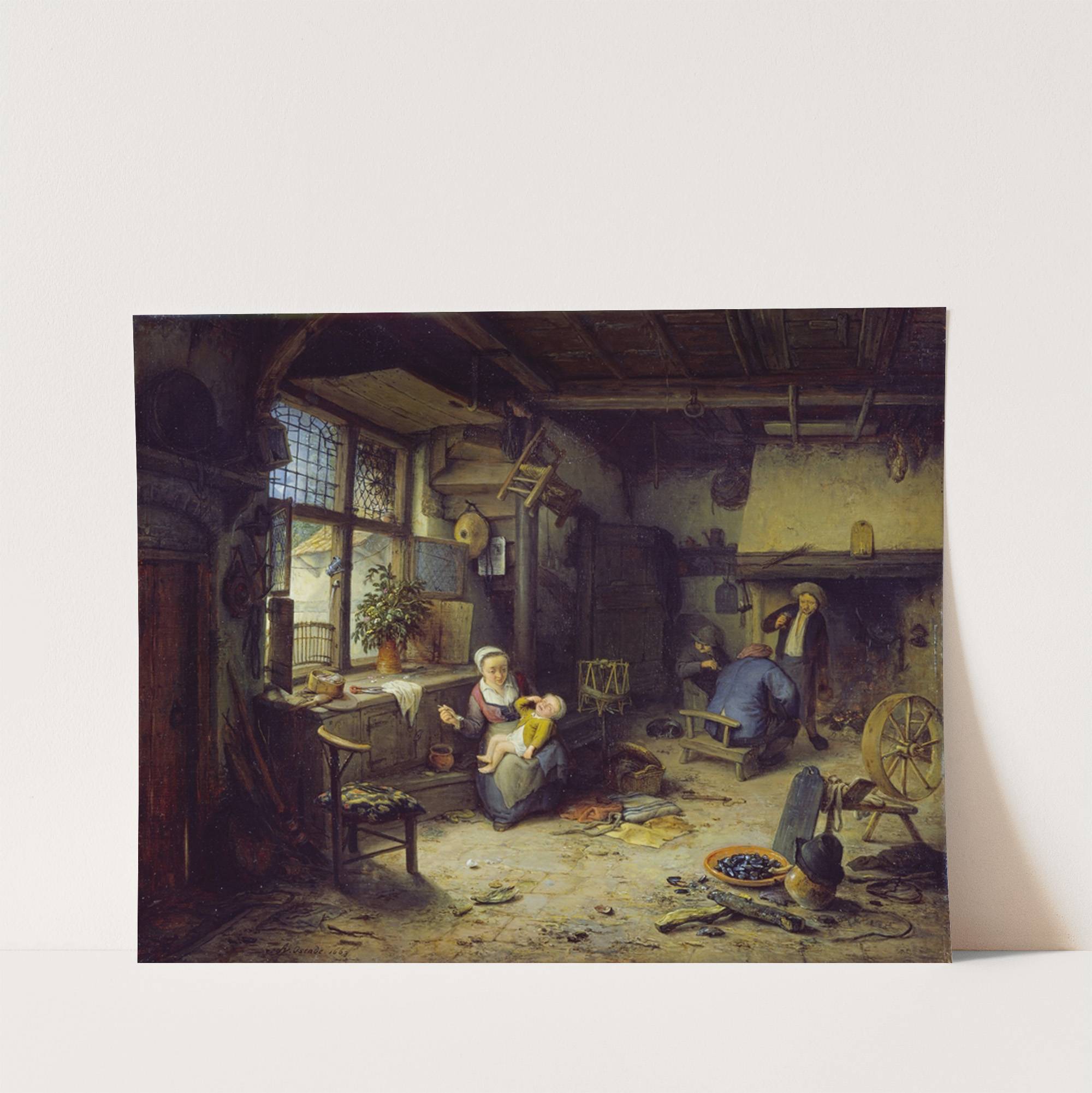 This beautifully detailed art print captures the rustic charm of a 17th-century Dutch interior scene, titled "Interior with Peasants" by Adriaen van Ostade. The warm, earthy color palette features muted browns and greens, contrasted by the soft yellow light filtering...
