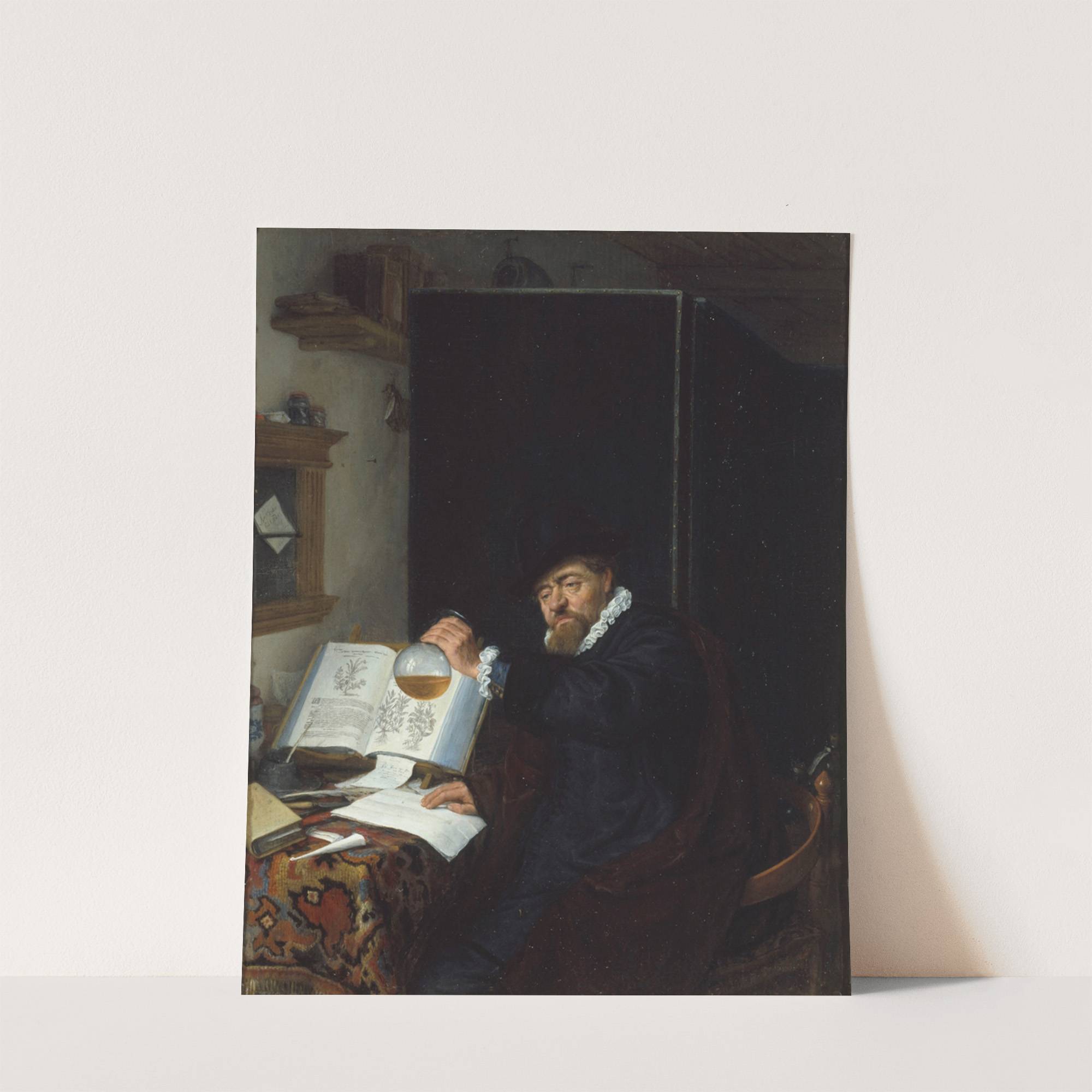 This art print features "L'Analyse" by Adriaen van Ostade, a classic still life painting from the Dutch Golden Age. The subject is a bearded man in period attire, seated at an ornate table adorned with a vividly patterned cloth. He...