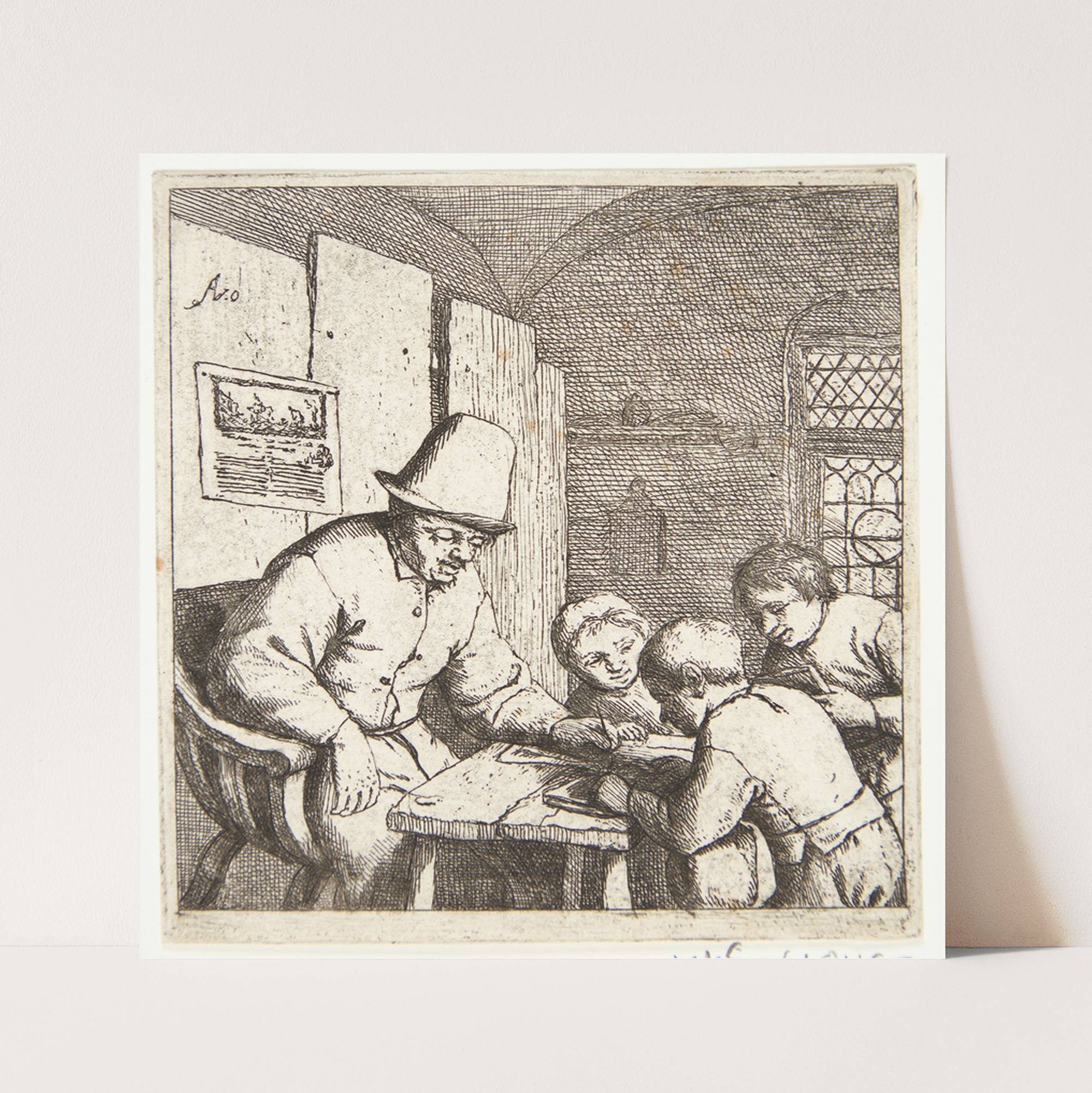 This black-and-white etching by Adriaen van Ostade depicts a group of four men gathered around a wooden table, engaged in reading or discussing papers laid out before them. The artist uses fine linework and cross-hatching to create depth and texture,...