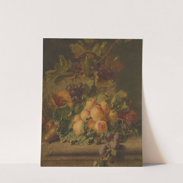 Discover the elegance of "Vruchten" by Adriana Johanna Haanen—a classical still life painting that exudes natural beauty and artistry. This masterpiece features a vibrant array of fruits and foliage set against a rich, dark background. At the center are ripe...