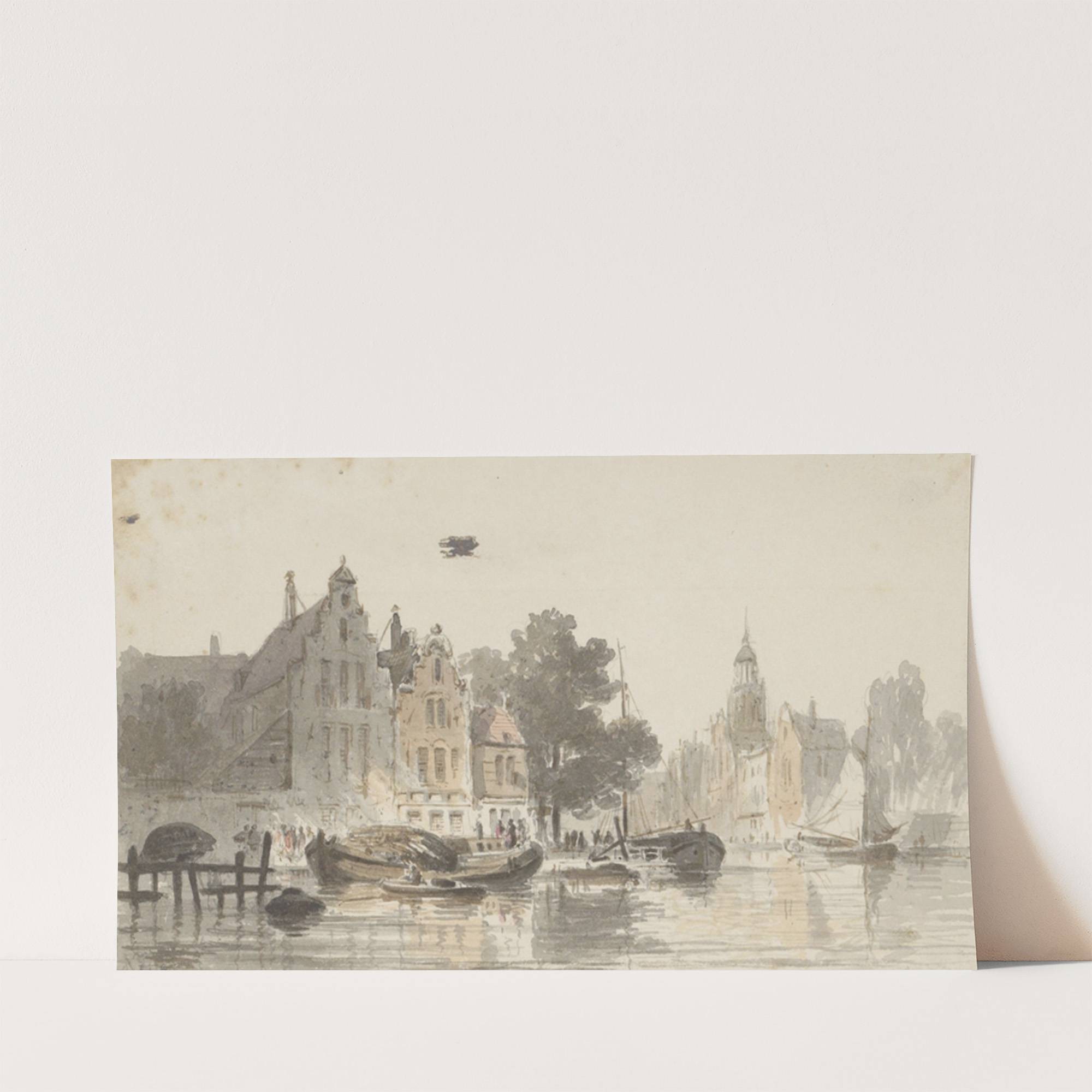 This art print captures "Stadsgezicht met kanaal" by Adrianus Eversen, a serene watercolor depiction of a quaint European canal scene. The composition features charming buildings with detailed facades and steeply pitched roofs along the waterfront. A row of small boats...