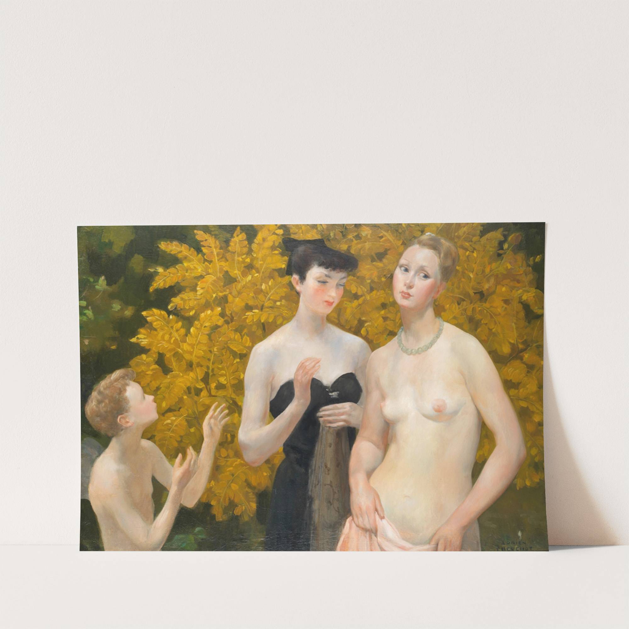 This digital painting titled "Bather and Companions" by artist Adrien Thevenot features a classical-style portrait with a delicate, semi-realistic approach. The scene includes three figures set against a lush backdrop of vibrant yellow leaves, creating a warm contrast to the...