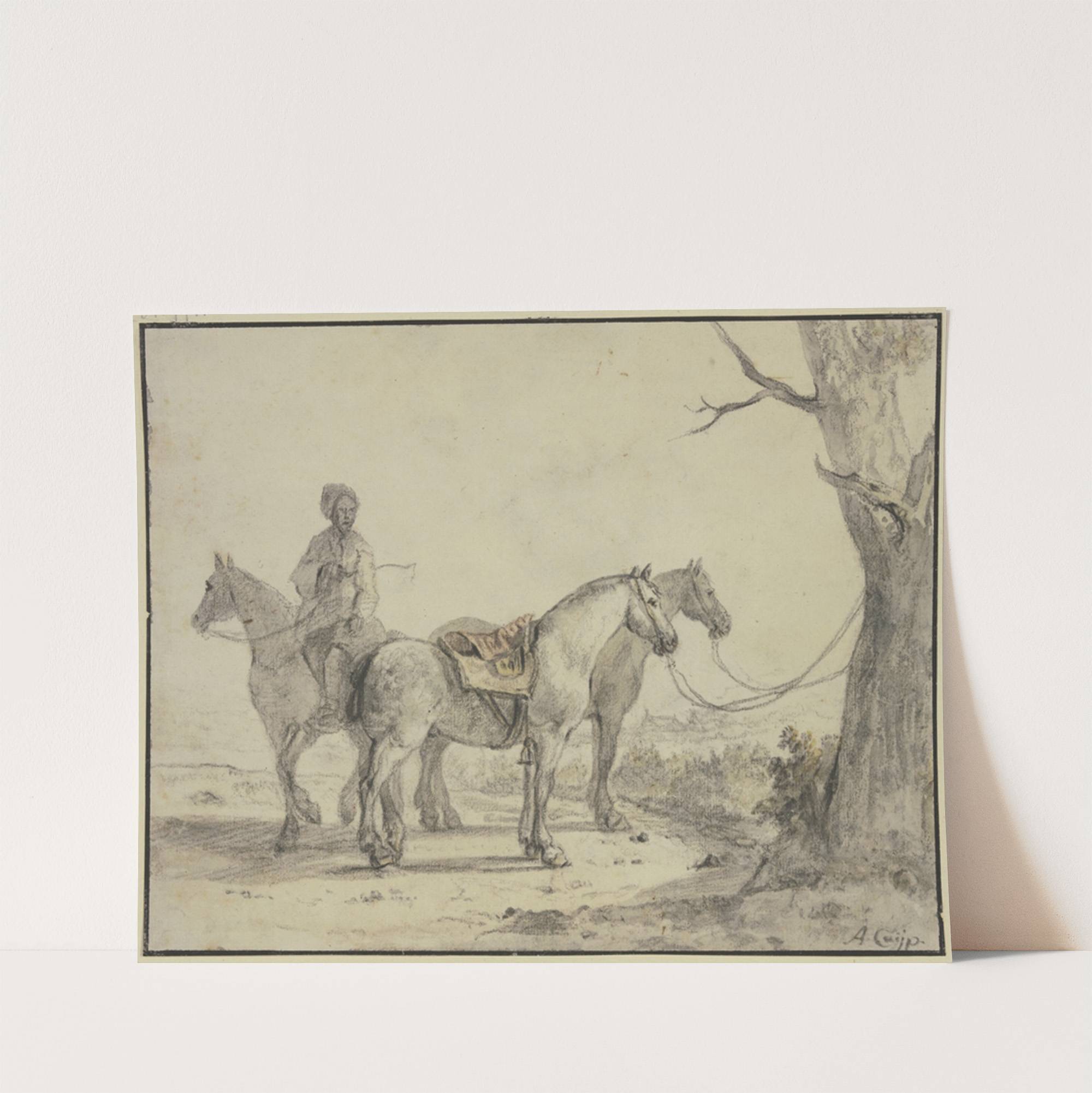 This exquisite artwork is a classic drawing titled "Zwei gesattelte Pferde an einen Baum gebunden" by the renowned artist Albert Cuyp. Rendered in delicate monochromatic pencil and wash, the scene captures two horses standing side by side near a large...