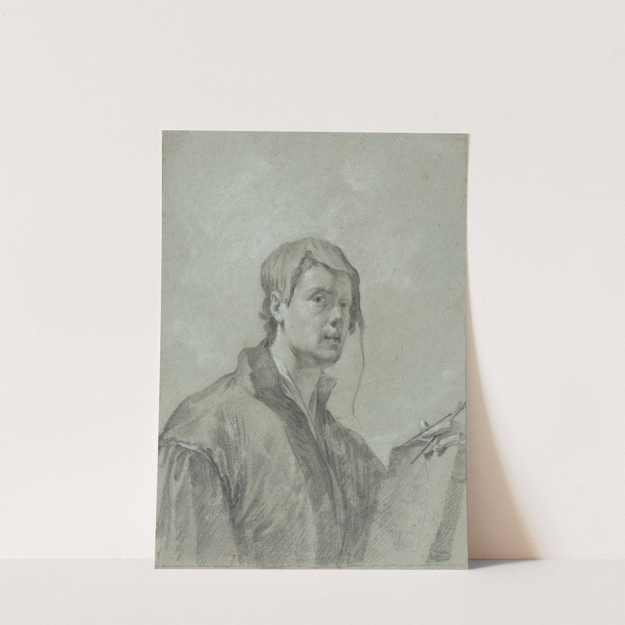This artistic print features "An Artist Holding a Book and Compass" in the style of After Willem Drost. Rendered in soft monochromatic tones, this piece captures an intriguing portrait of a young artist. The subject is depicted from the waist...