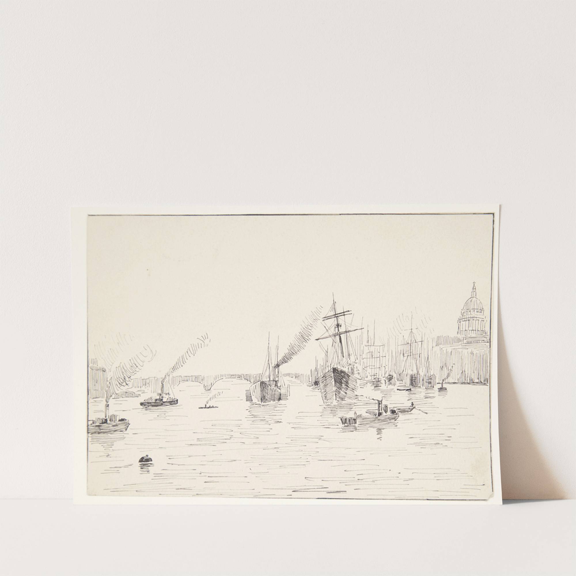 This black-and-white line drawing titled "Udsigt over Seinen" by Agnes Lunn features a serene maritime scene. The artist uses fine, precise lines to depict several small boats floating gently on the water's surface. In the foreground, three ducks swim near...