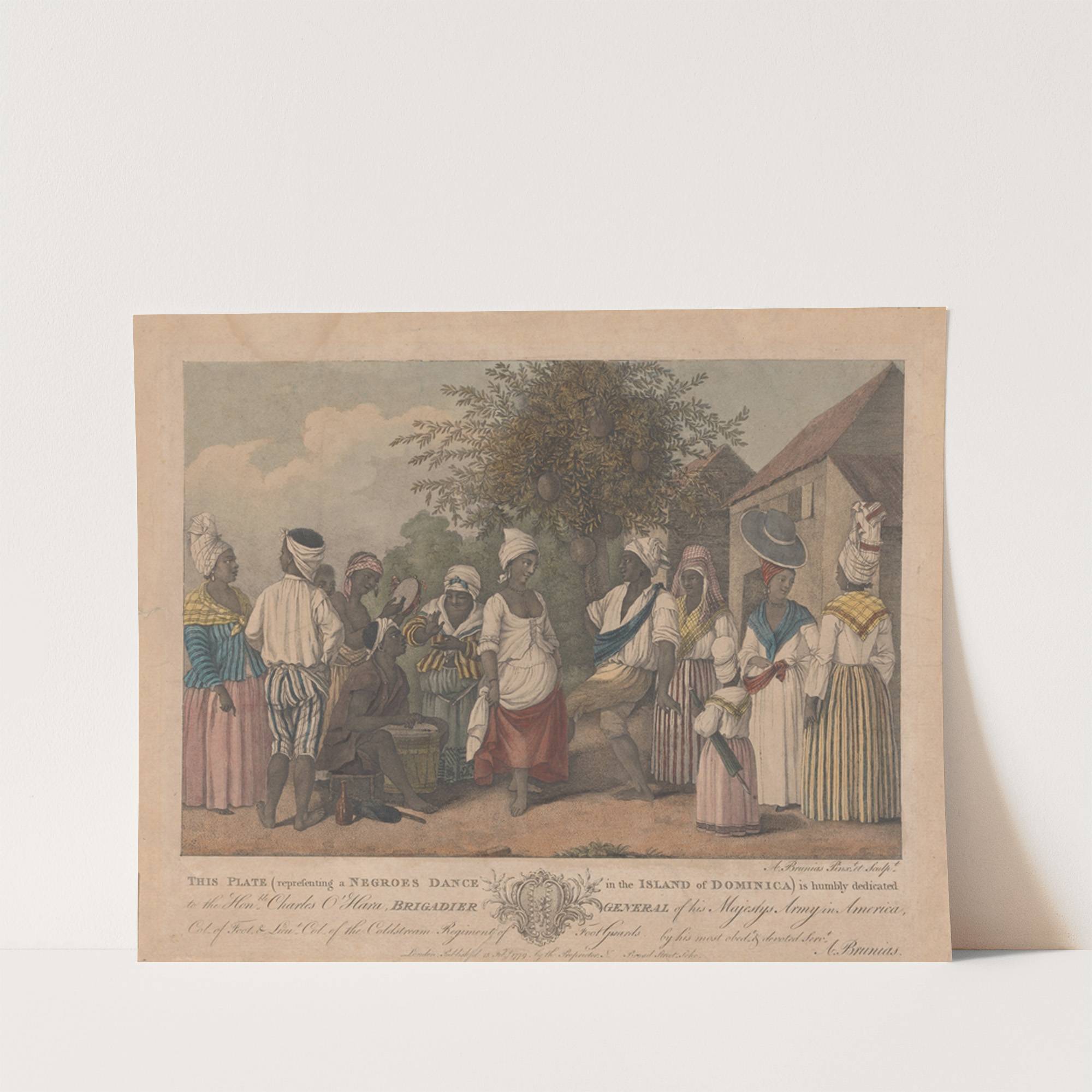 This beautifully crafted print is titled "A Negroes Dance in the Island of Dominica" by the renowned artist Agostino Brunias. This piece captures a vibrant and lively scene featuring a group of Black men and women engaged in a traditional...
