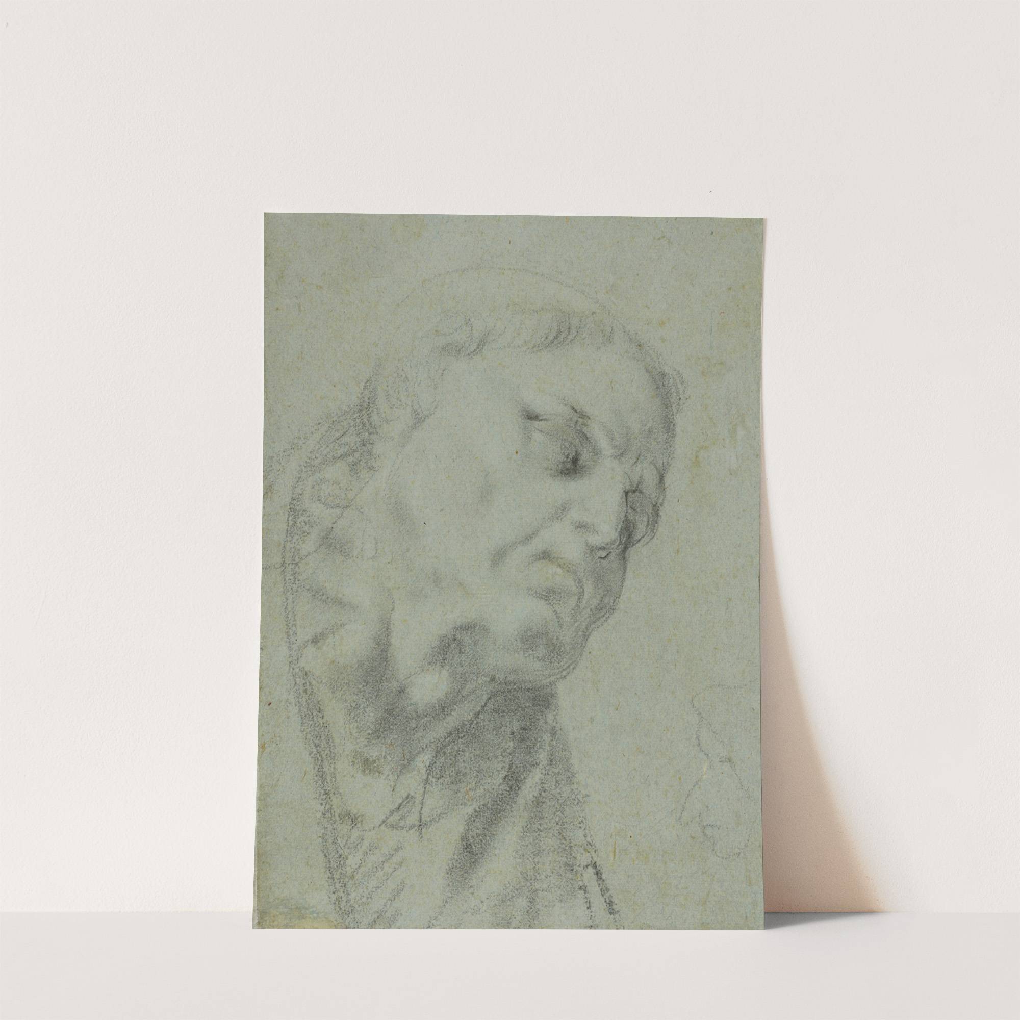 This delicate pencil sketch showcases "Head of a Monk" by the renowned artist Agostino Carracci. The monochromatic drawing captures the subtle nuances and gentle curves of the monk's face with remarkable precision, emphasizing the soft contours and serene expression. The...