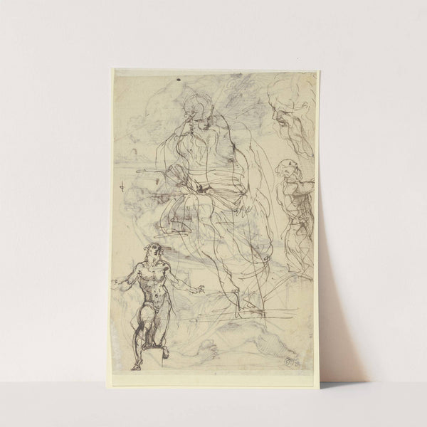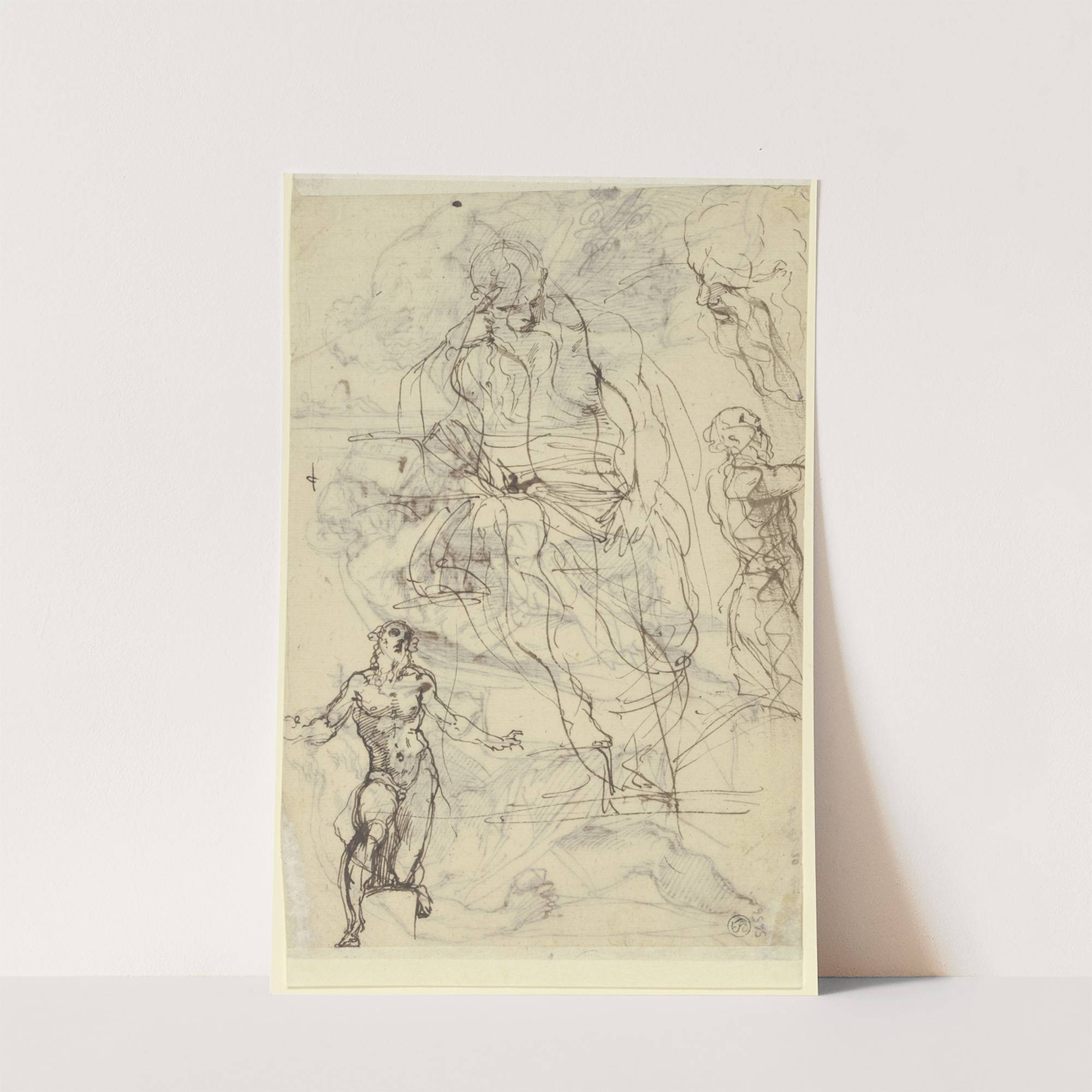 This artwork is a highly detailed pencil sketch titled "Studien zu einem Heiligen Hieronymus" by the renowned artist Agostino Carracci. The piece showcases multiple studies of human figures in a classical, Baroque style. At the center, a muscular male figure...