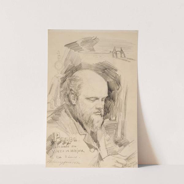 This black-and-white sketch captures a contemplative portrait of a bearded man engrossed in reading. The artist, Akseli Gallen-Kallela, employs fine pencil strokes to create an intricate yet delicate texture that highlights the subject's thoughtful expression and the subtle interplay of...