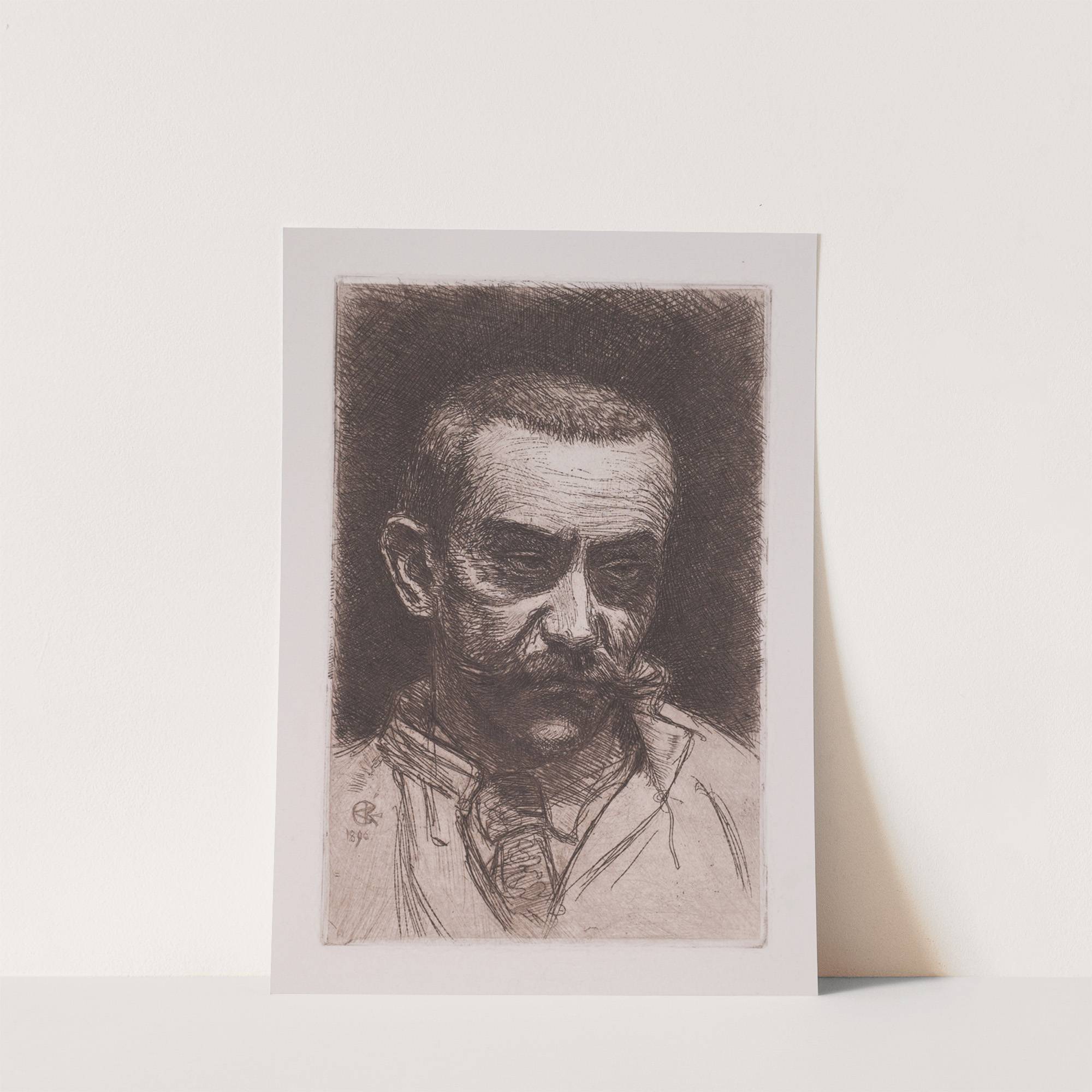 This artwork is a striking monochromatic sketch by Louis Sparre, capturing the likeness of Finnish artist Akseli Gallen-Kallela. Rendered in detailed black ink on white paper, the portrait features meticulous cross-hatching and shading techniques that highlight the textures of the...
