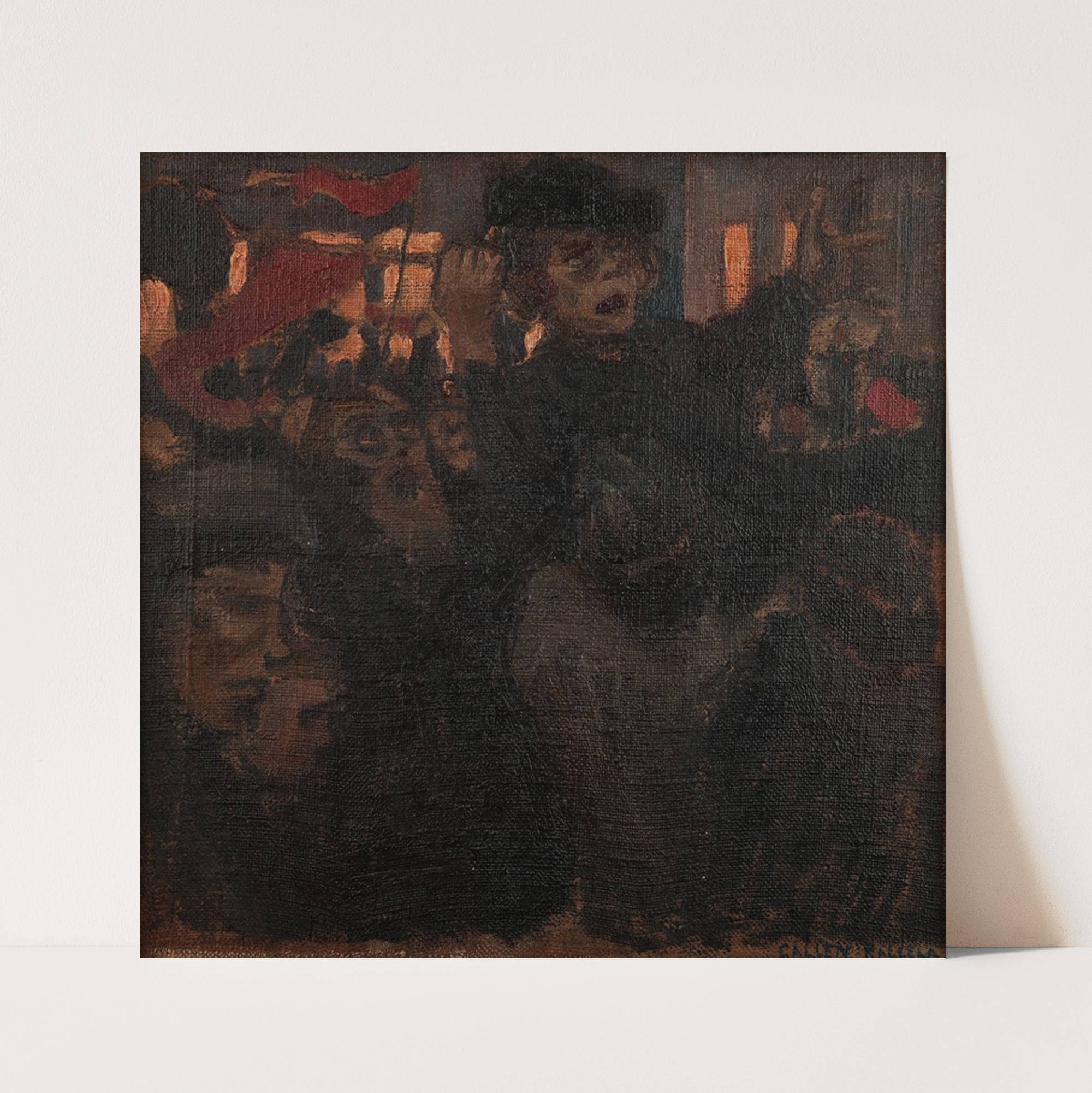 This artwork is a captivating painting titled "Punalippu" by the renowned artist Akseli Gall?n-Kallela. The piece is richly textured with expressive, dark brushstrokes that create an almost moody atmosphere. Central to the composition is a figure shrouded in shadow, their...