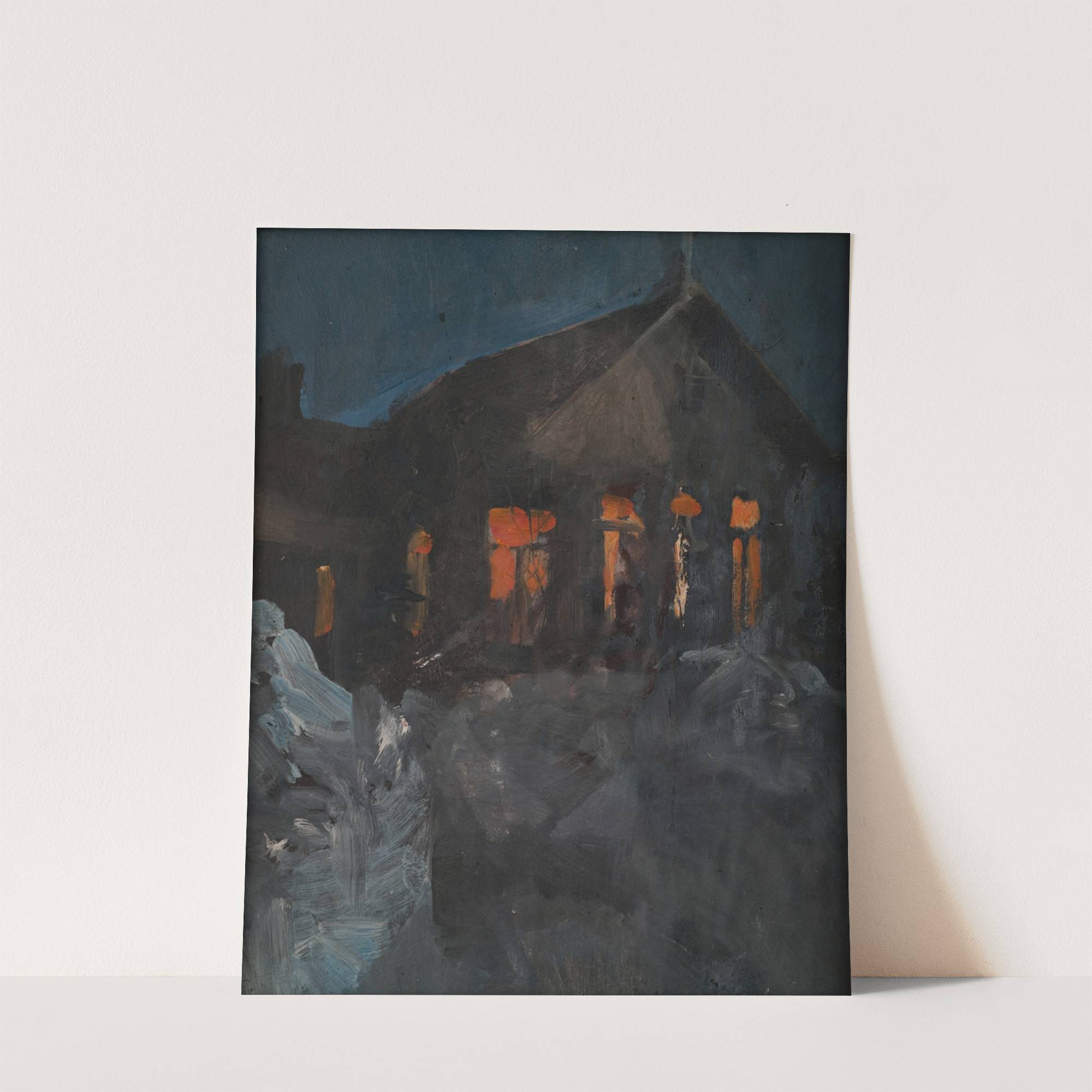 This striking print features "Yöaika Malmilta" by the renowned Finnish artist Akseli Gallén-Kallela. The artwork employs a dramatic, almost moody color palette dominated by deep blues and blacks, evoking the quiet, mysterious atmosphere of nightfall. Bright, glowing orange light seeps...