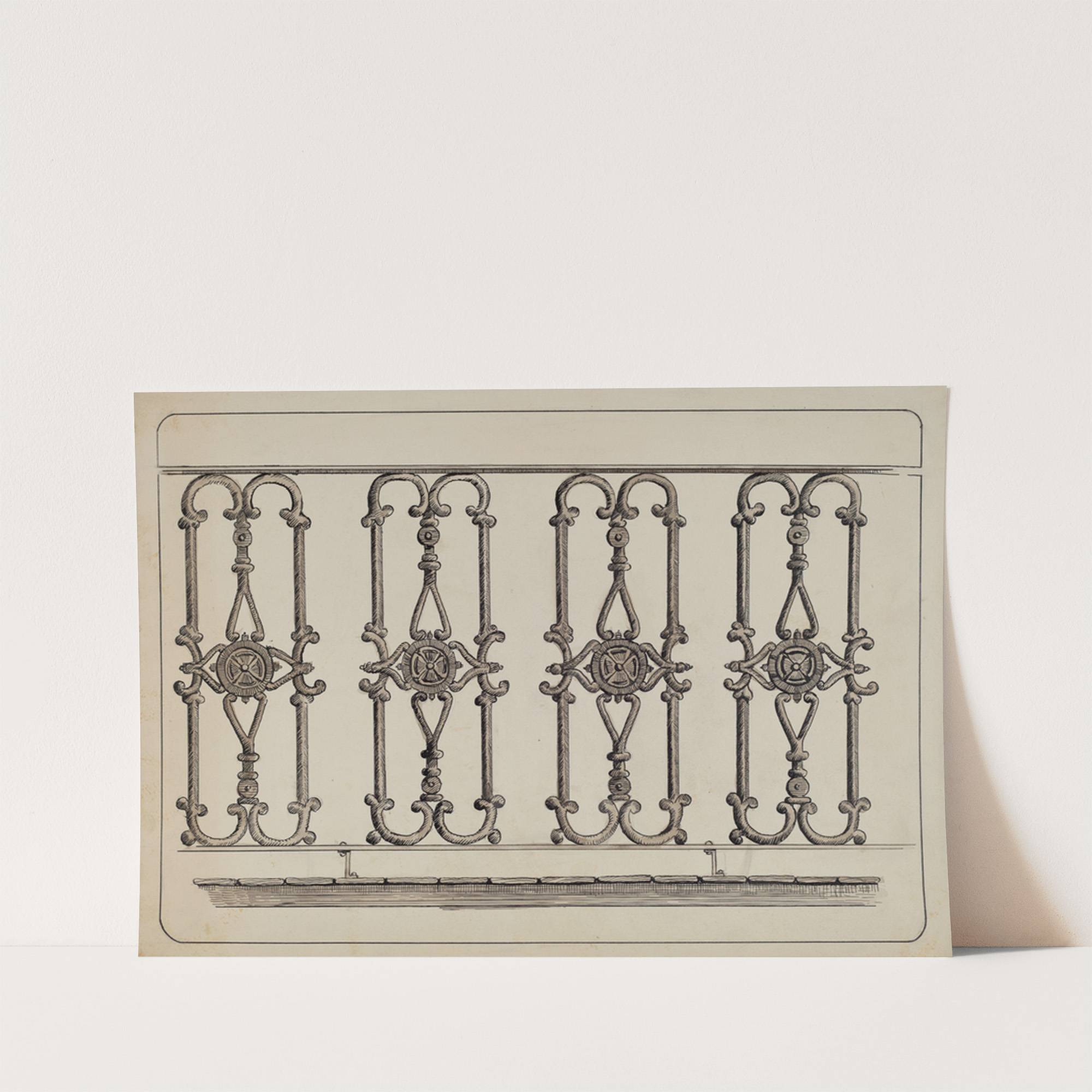 This intricately detailed black-and-white line drawing captures the elegance of a wrought iron balcony railing design. The artwork, titled "Cast Iron Balcony Rail" by Al Curry, showcases five vertical panels adorned with ornate patterns. Each panel features symmetrical floral motifs...