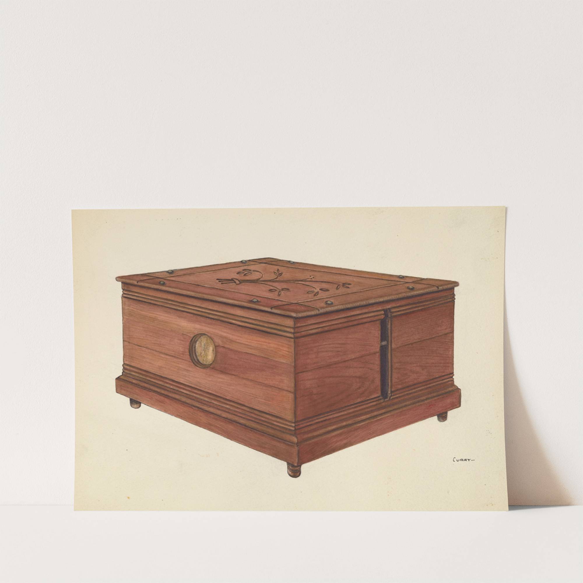 This beautifully crafted art print features "Desk Bell from Fire Department" by artist Al Curry. The artwork showcases an elegant wooden box with rich, warm tones that highlight the natural grain of the wood. The box is rectangular with a...