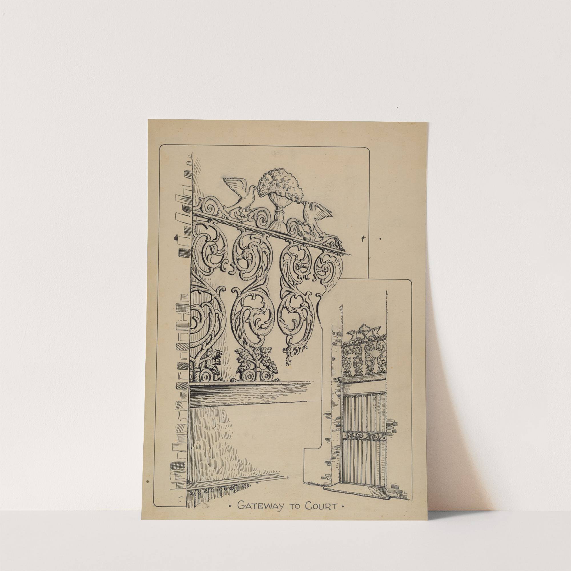 "Gateaway to Court" is a charming black and white line drawing by artist Al Curry. This intricate illustration captures the elegance of architectural details with precision and style. The focal point of the piece features an ornate, carved wooden doorway...
