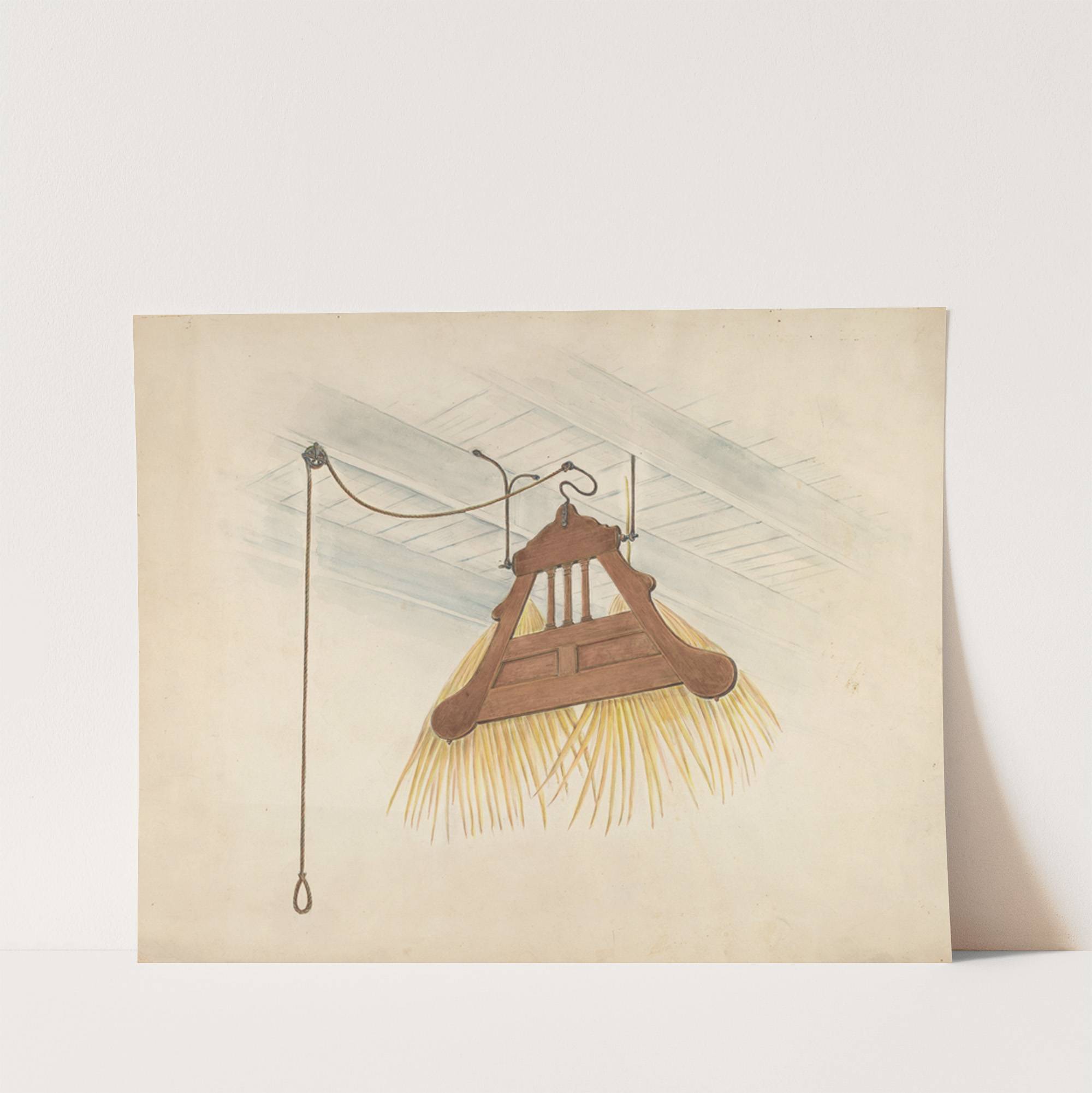 This art print showcases "Swinging Fan" by Al Curry, featuring a rustic, handcrafted wooden fan hanging from the ceiling. The fan is crafted with care using natural wood tones that highlight its detailed craftsmanship. The wooden structure includes an intricate...