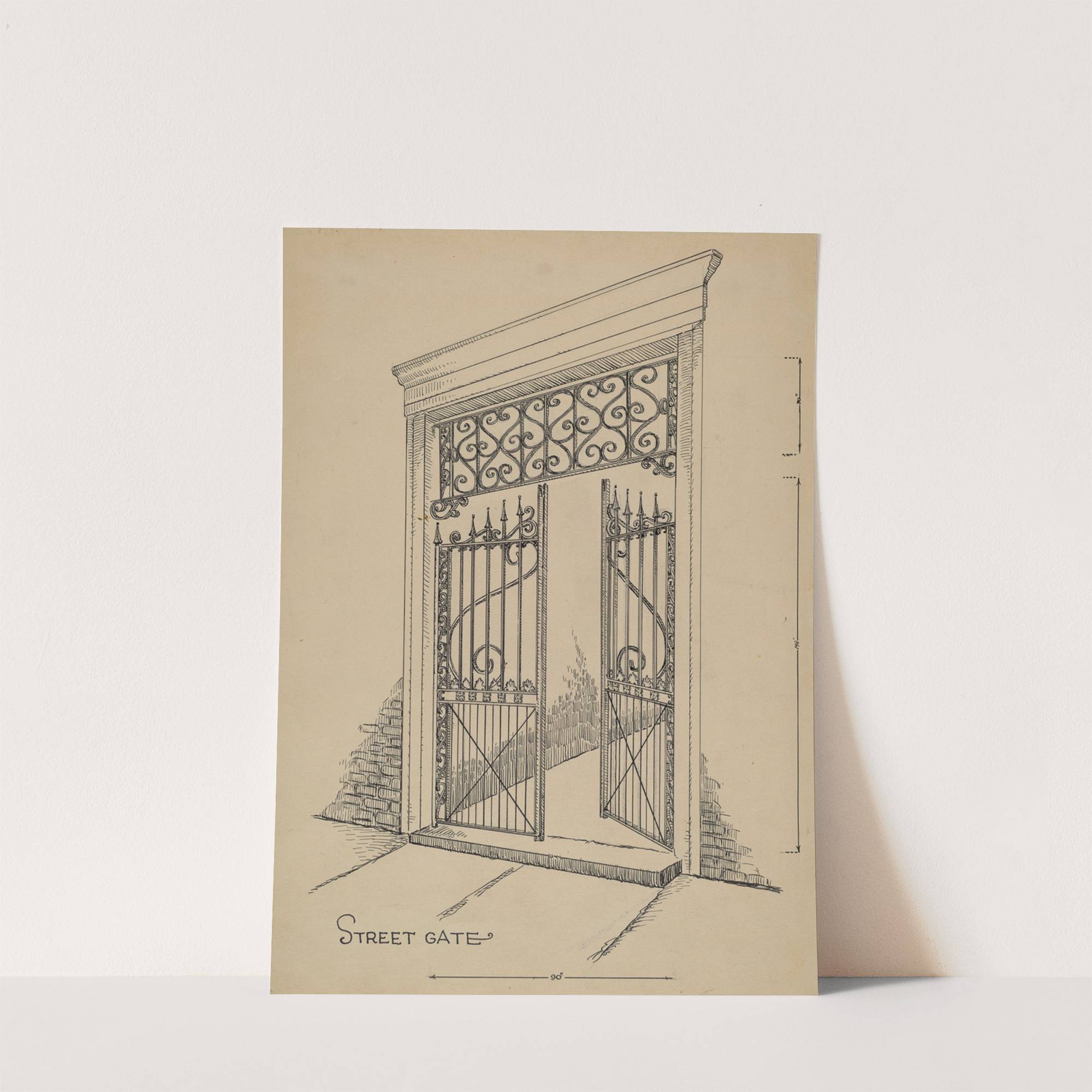This elegant black-and-white line drawing features a wrought iron gate set within a classic street entrance. The artwork showcases intricate ironwork with ornate scroll patterns on the upper section of the gates. The doors are divided into vertical segments, each...
