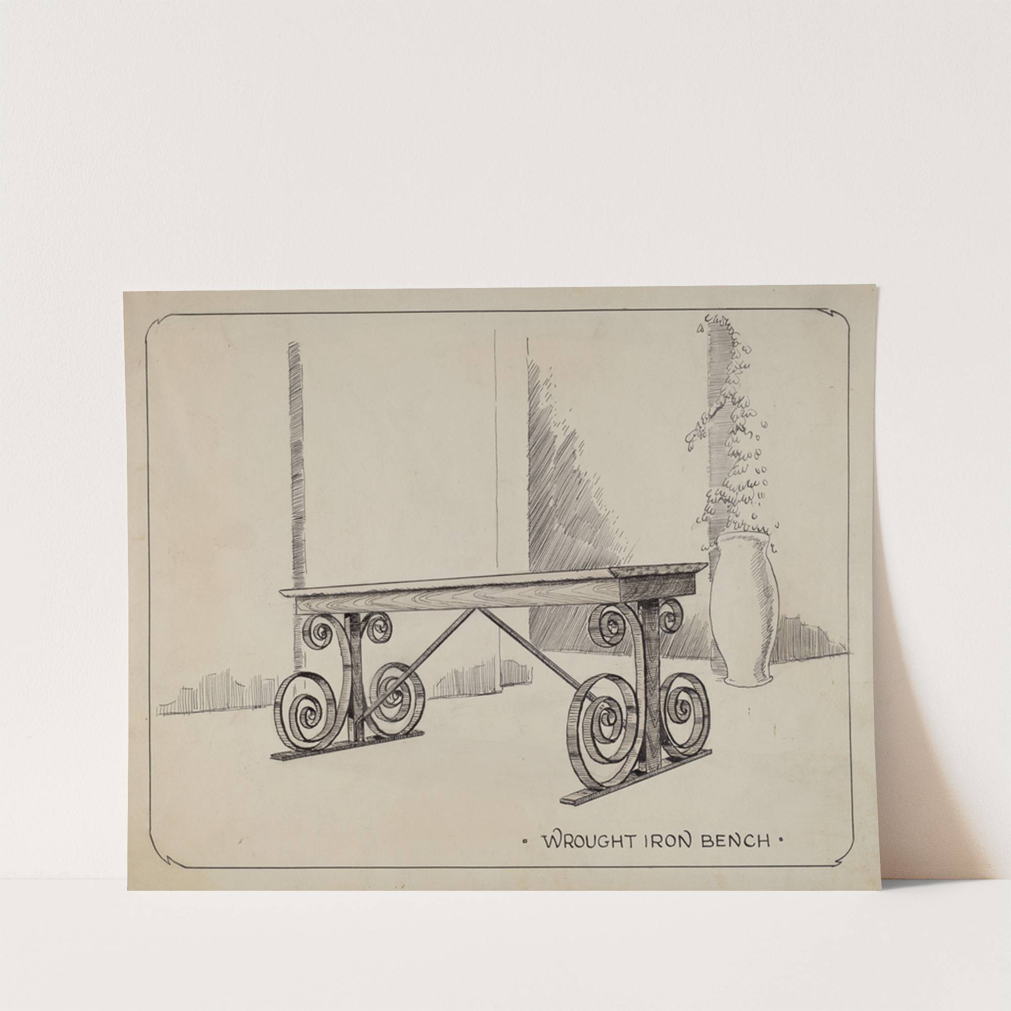 This elegant black-and-white illustration features a wrought iron bench with intricate scrollwork on its legs and support brackets, beautifully capturing the classic design elements of traditional craftsmanship. The bench is depicted in meticulous detail, showcasing the delicate curves and twists...