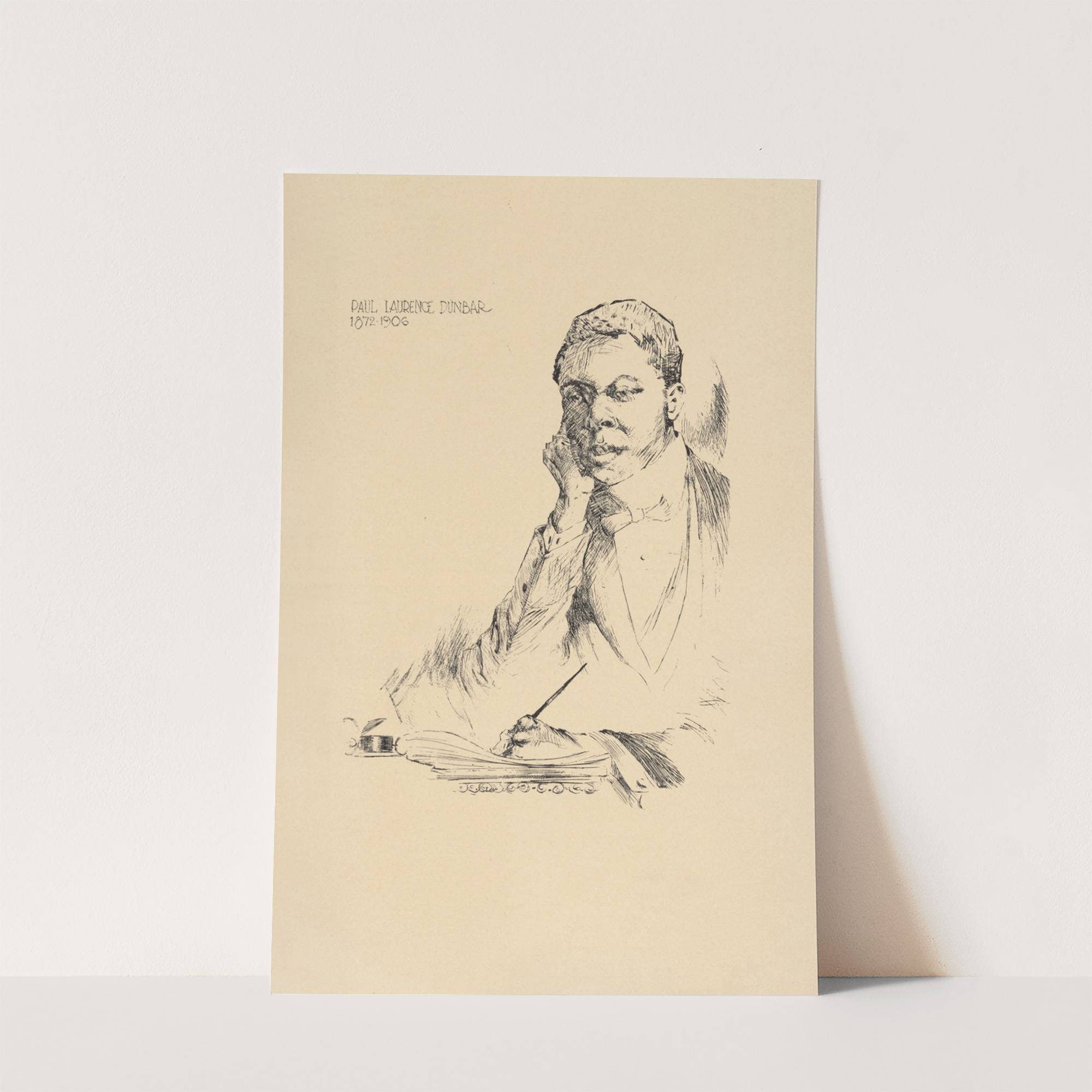 This artwork is a black-and-white pencil sketch of the poet Paul Laurence Dunbar, created in a classic realist style by artist Albert Alexander Smith in 1925. The subject is depicted from the waist up, with his head slightly tilted to...