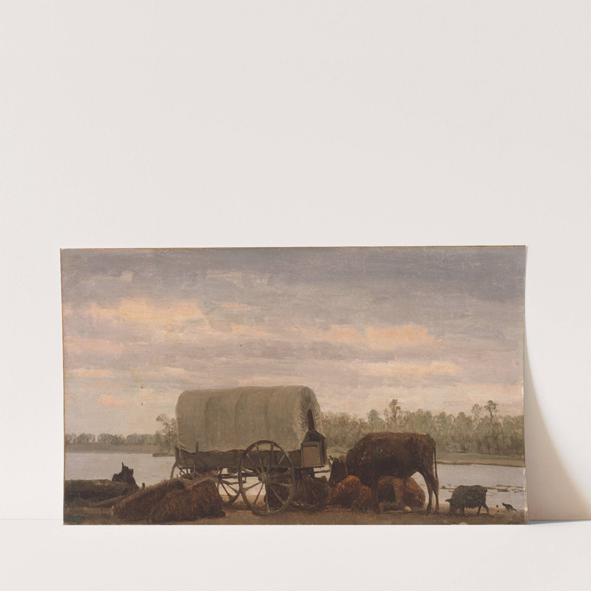 Experience the timeless beauty of "Estes Park Morning, Colorado" by Albert Bierstadt, a masterpiece that captures the serene essence of rural life in the American West. This meticulously detailed painting depicts a covered wagon parked beside a gentle river, its...