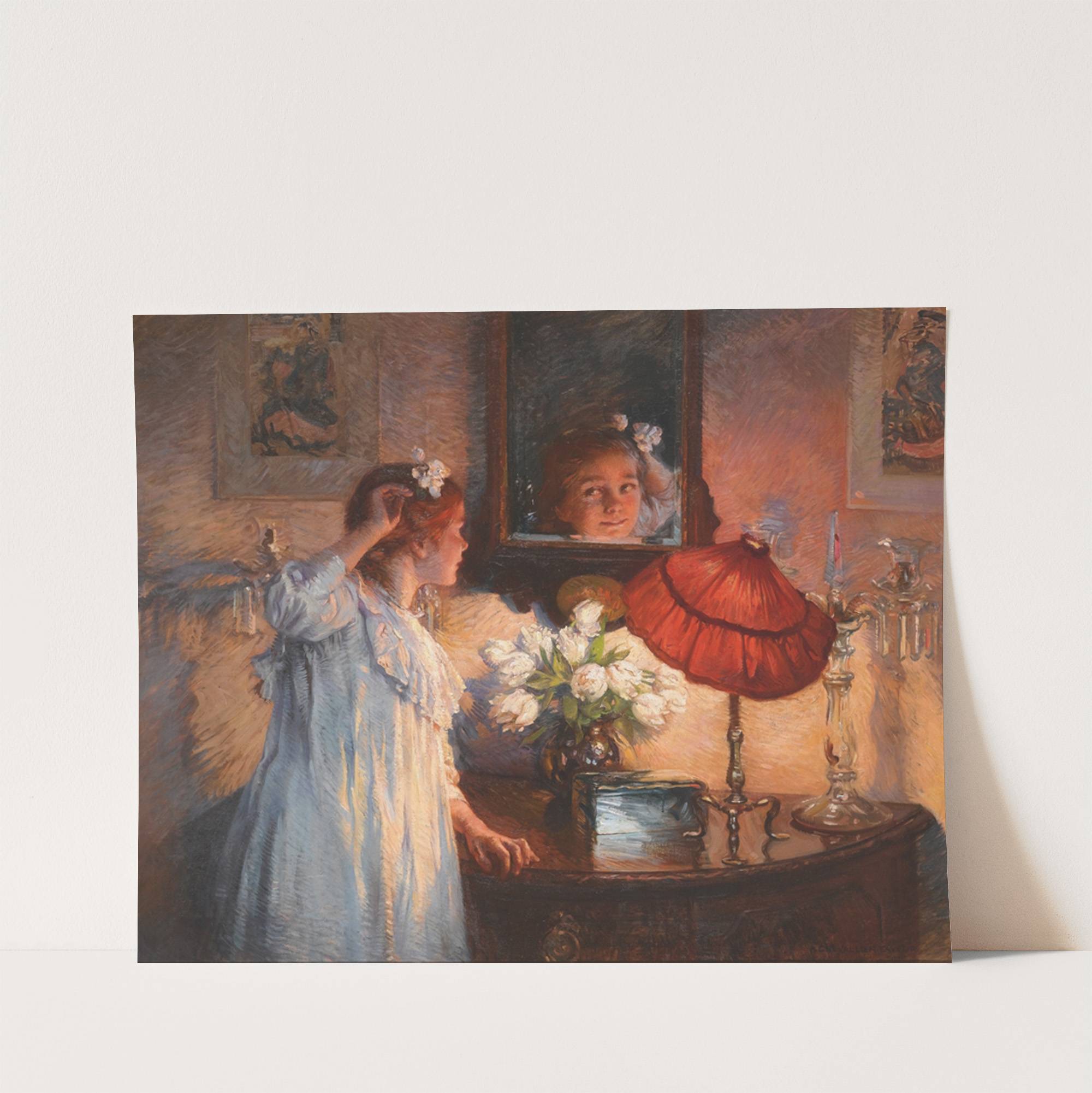 This vibrant art print titled "The Mirror" by Albert Chevallier Taylor captures an intimate moment with warm, rich hues. The scene depicts a young girl in a flowing blue nightgown standing before a wooden vanity table adorned with various elegant...