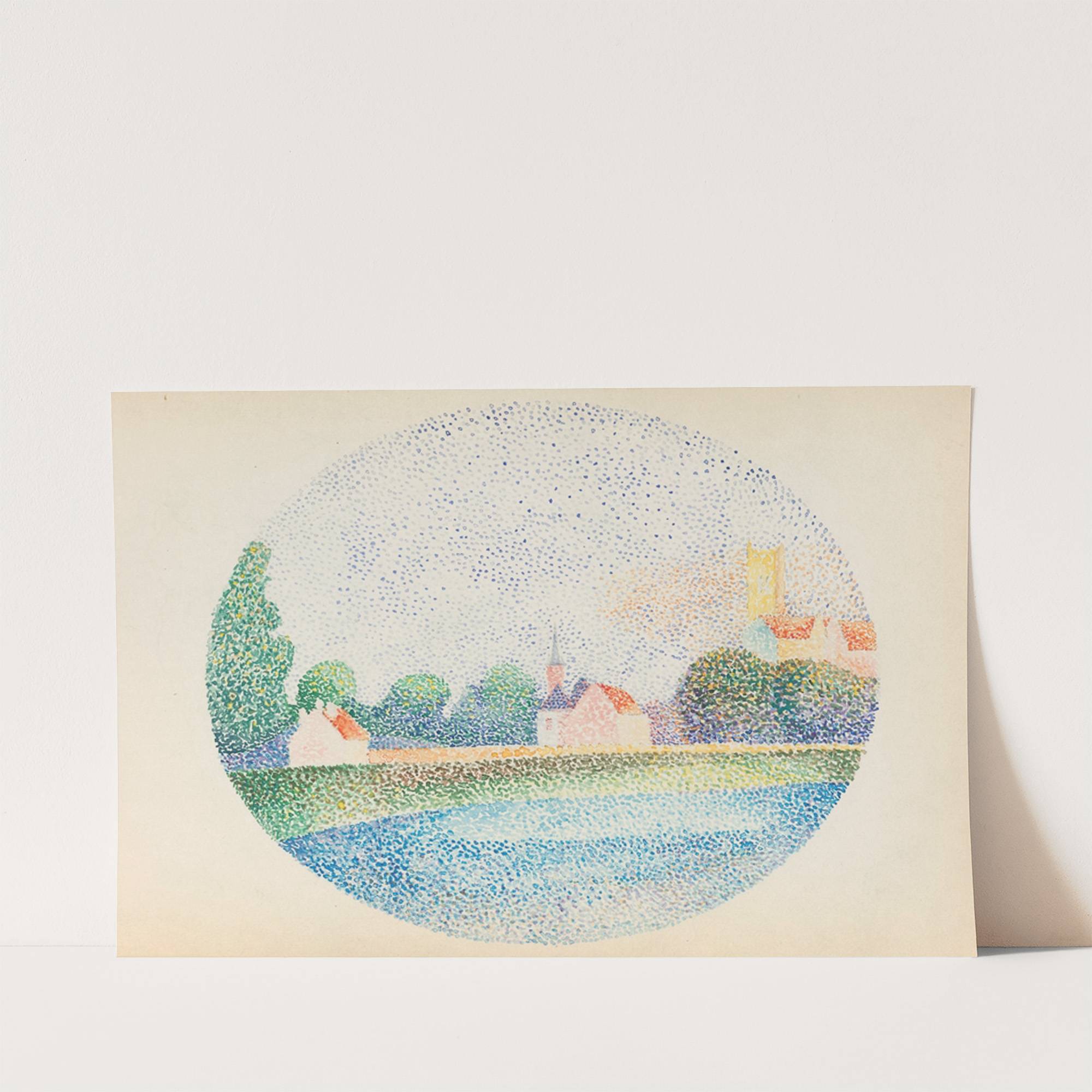 This vibrant art print captures "Morning on the Marne at Meaux" by Albert Dubois-Pillet, rendered in a charming pointillist style. The circular composition is bursting with color, featuring a serene riverside scene. Soft blues and greens dominate the river's surface,...