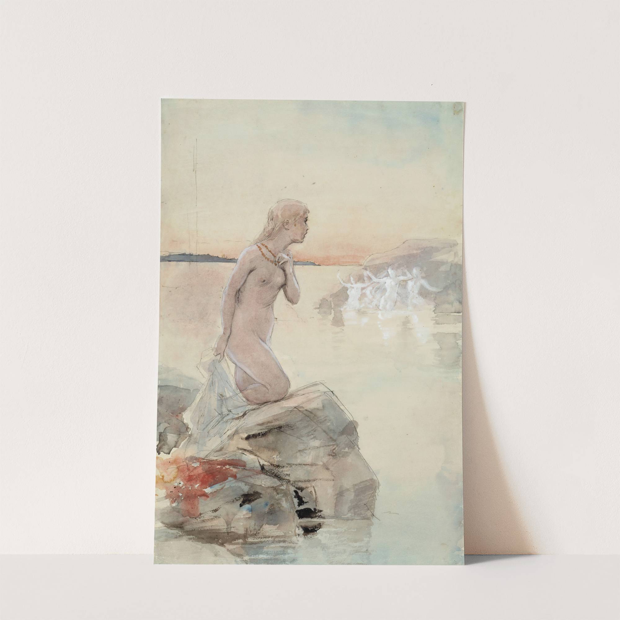 This elegant watercolor print by Albert Edelfelt depicts "Aino," a beautiful portrayal of a young woman standing nude on rocky terrain by the water's edge. The subject is shown in profile with her back slightly turned, looking towards the horizon...