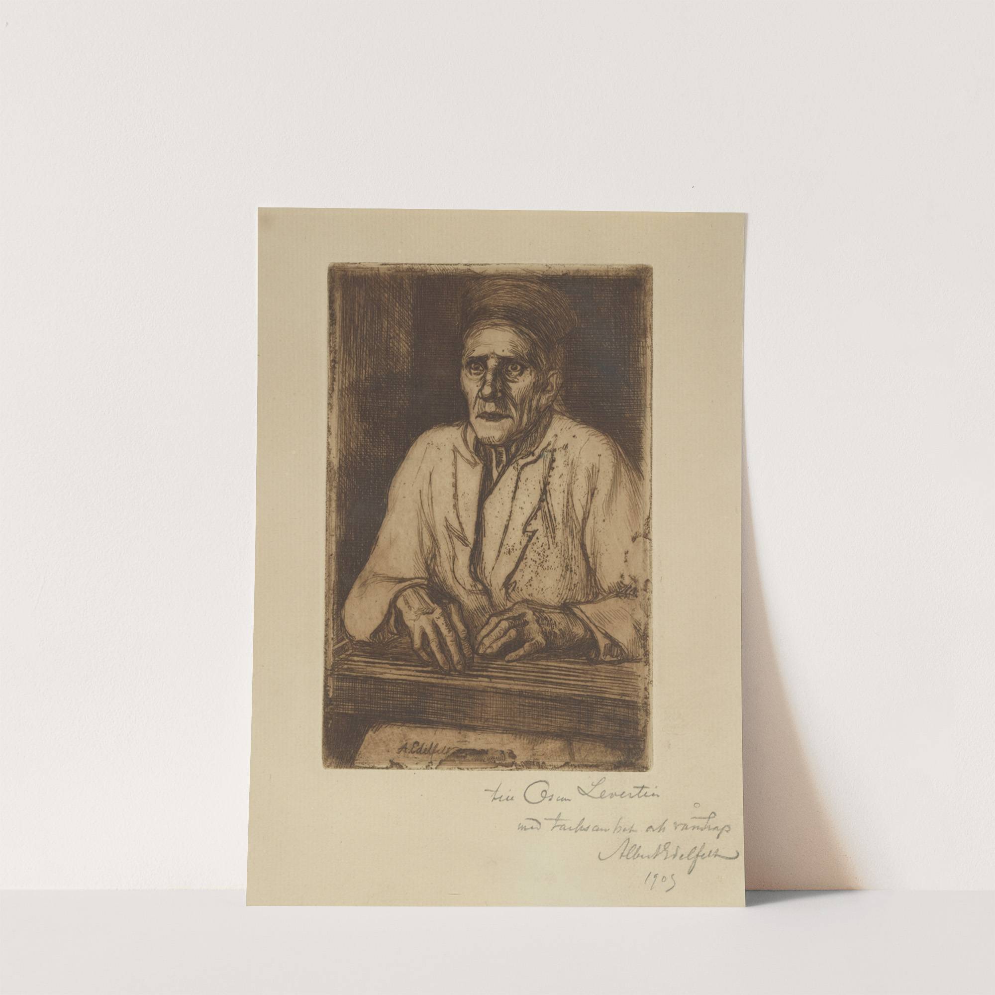 This artwork is an evocative monochromatic etching titled "Kantele" by the renowned artist Larin Paraske, dating back to 1855. The piece captures an elderly man seated at a table, his expressive face deeply engrossed in thought or contemplation. The artist...