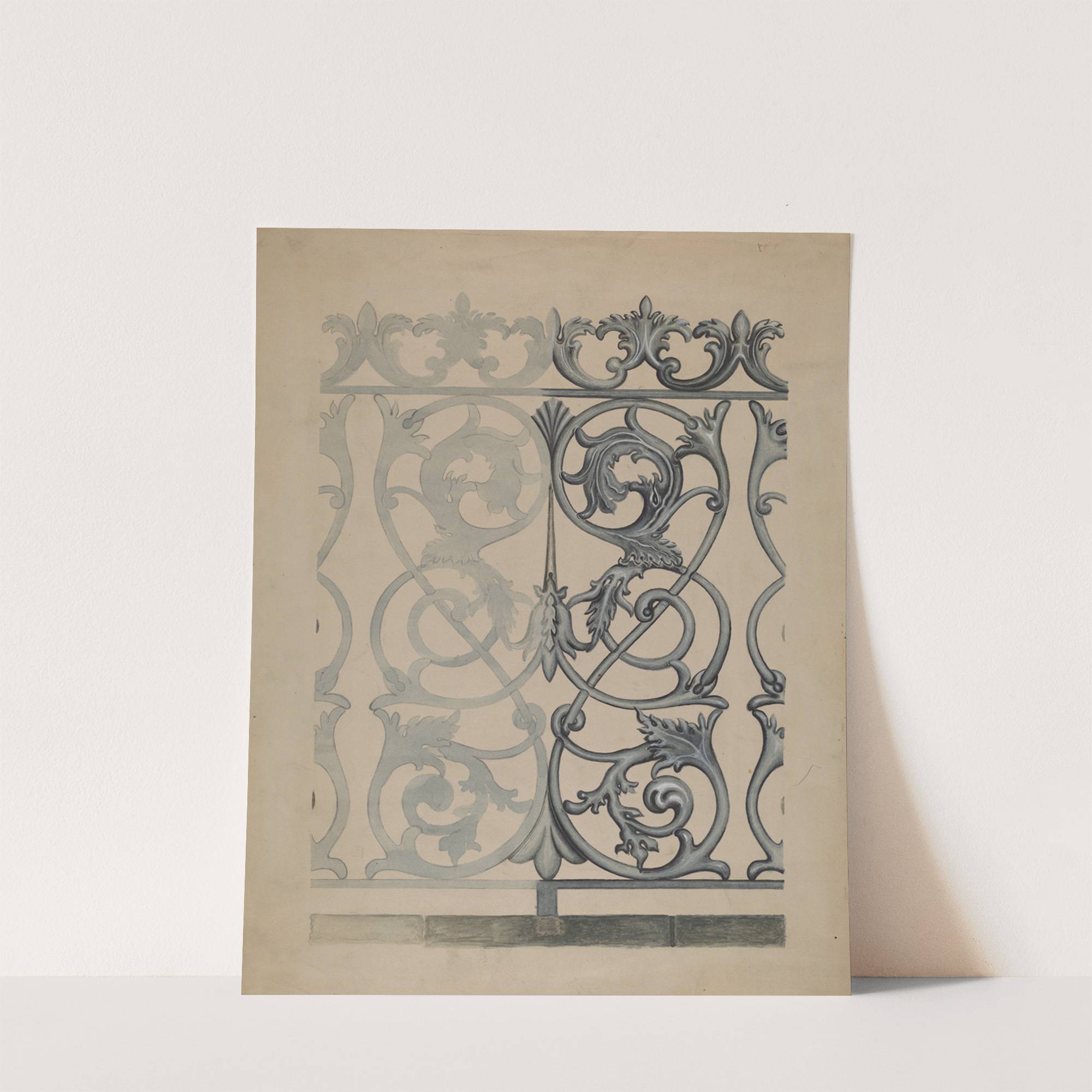 This artwork, "Iron Fence" by Albert Eyth, is a captivating piece showcasing intricate ironwork designs in elegant blue ink. The delicate patterns feature swirling floral motifs, intricately interwoven with curved linThe composition is balanced yet dynamic, with symmetrical elements on...