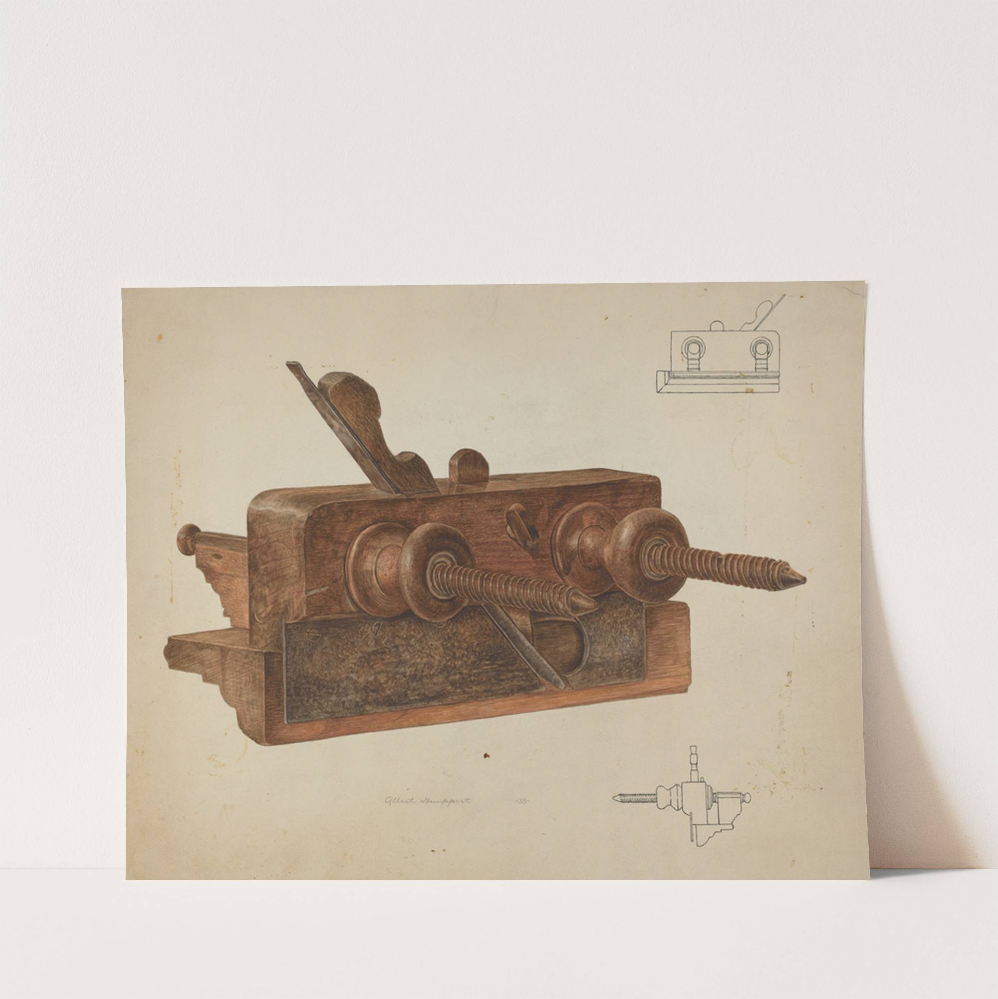 This intricately detailed art print showcases an antique wooden screwdriver assembly in warm shades of brown and reddish-brown, with a beautifully textured wood surface that highlights the craftsmanship. The piece features three round, knurled handles attached to a sturdy wooden...
