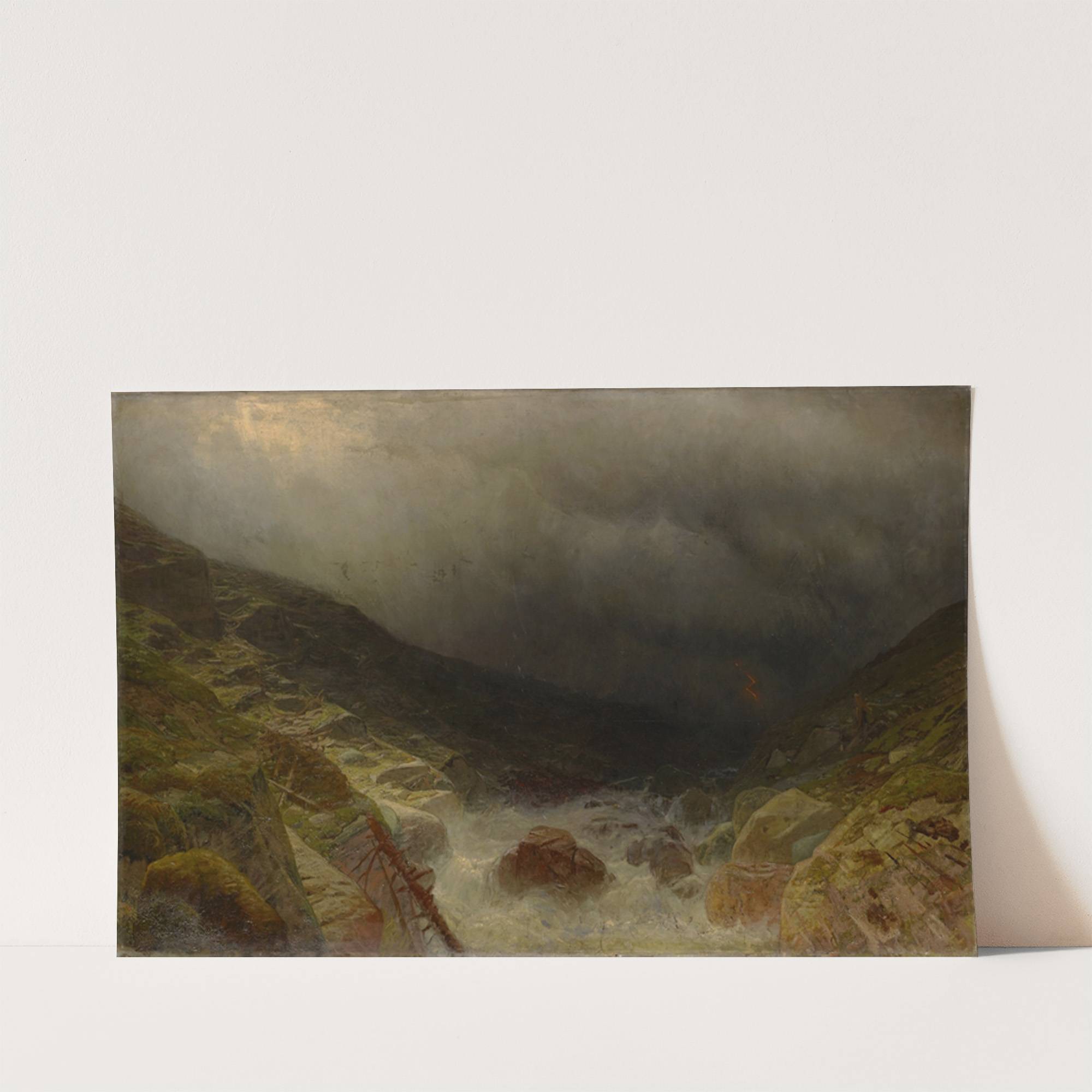 This striking digital print, "Tempest in Sefinen Valley near Lauterbrunnen" by artist Albert Gos, captures the raw, dramatic power of nature. The landscape features a rugged valley with large, jagged rocks and steep, rocky slopes that dominate the foreground. Dark,...