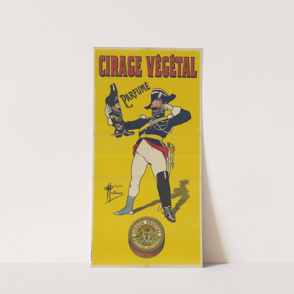 This vibrant art print features "Cirage Végétal Parfumé" by Albert Guillaume, created in 1914. The bold illustration showcases a stylized French soldier standing against a vivid yellow background. The soldier is depicted in traditional military attire with a dark blue...