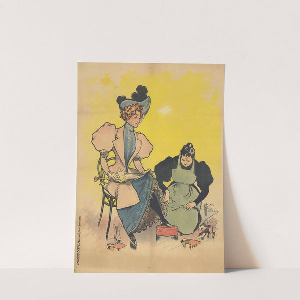 This art print features "El?gance essayant des chaussures" by Albert Guillaume, showcasing two women in an elegant, early 20th-century style. The standing woman has blonde curls peeking from under a blue bonnet adorned with black feathers. She wears a white...