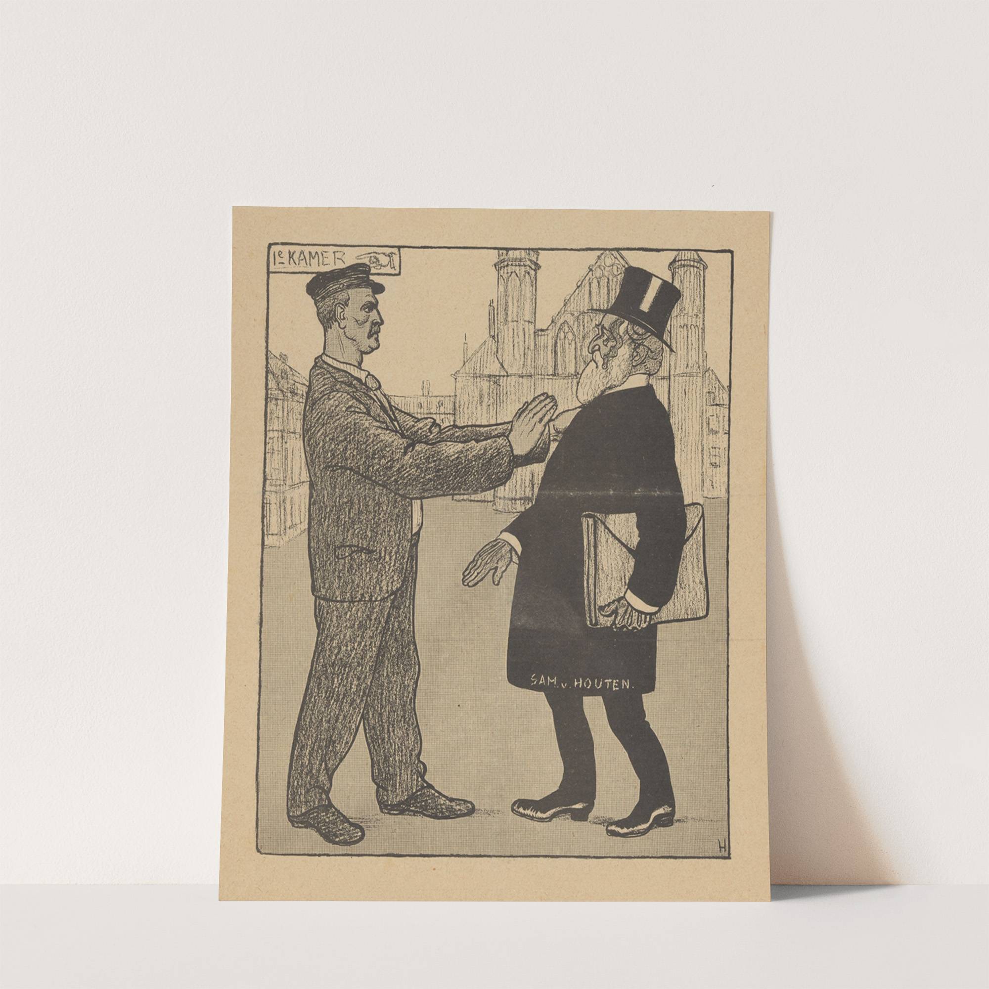 This black-and-white art print features two men in a formal meeting, depicted with strong lines and cross-hatching techniques that highlight the textures of their clothing. The man on the left is dressed in a suit with a checkered pattern, wearing...