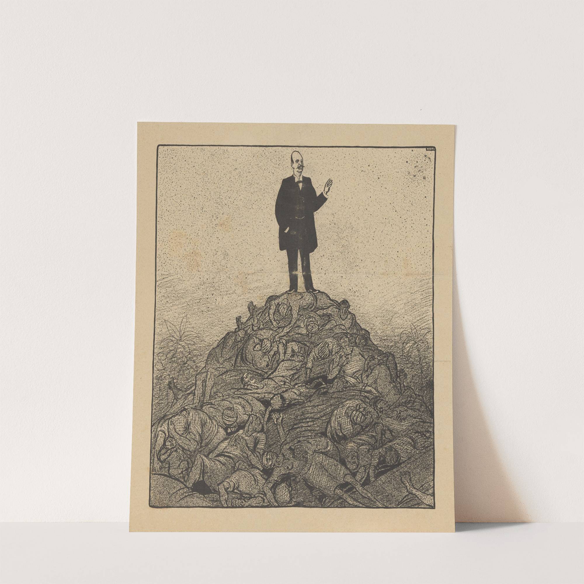 This striking black-and-white illustration by De Notenkraker, titled "Oost-Indisch Blind" from November 16, 1907, captures a powerful and poignant message. At the center stands a stern-looking man in formal attire, including a dark coat and bow tie, who is standing...