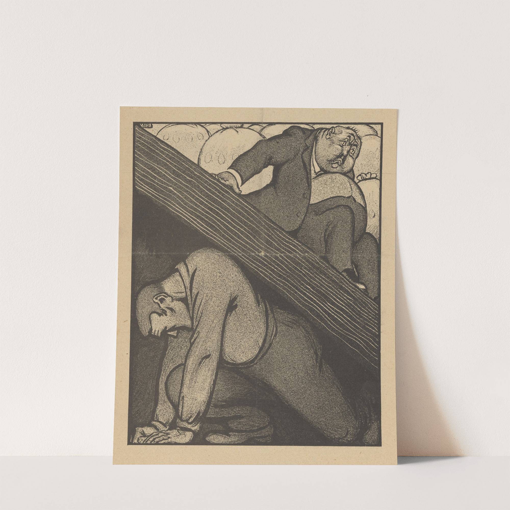 This monochromatic artwork, titled "De Notenkraker, 18 Mei 1907" by Albert Hahn, features a dramatic, almost surreal composition with strong contrasts and bold lines. The image portrays two men in a powerful struggle; the man at the bottom is crouched...
