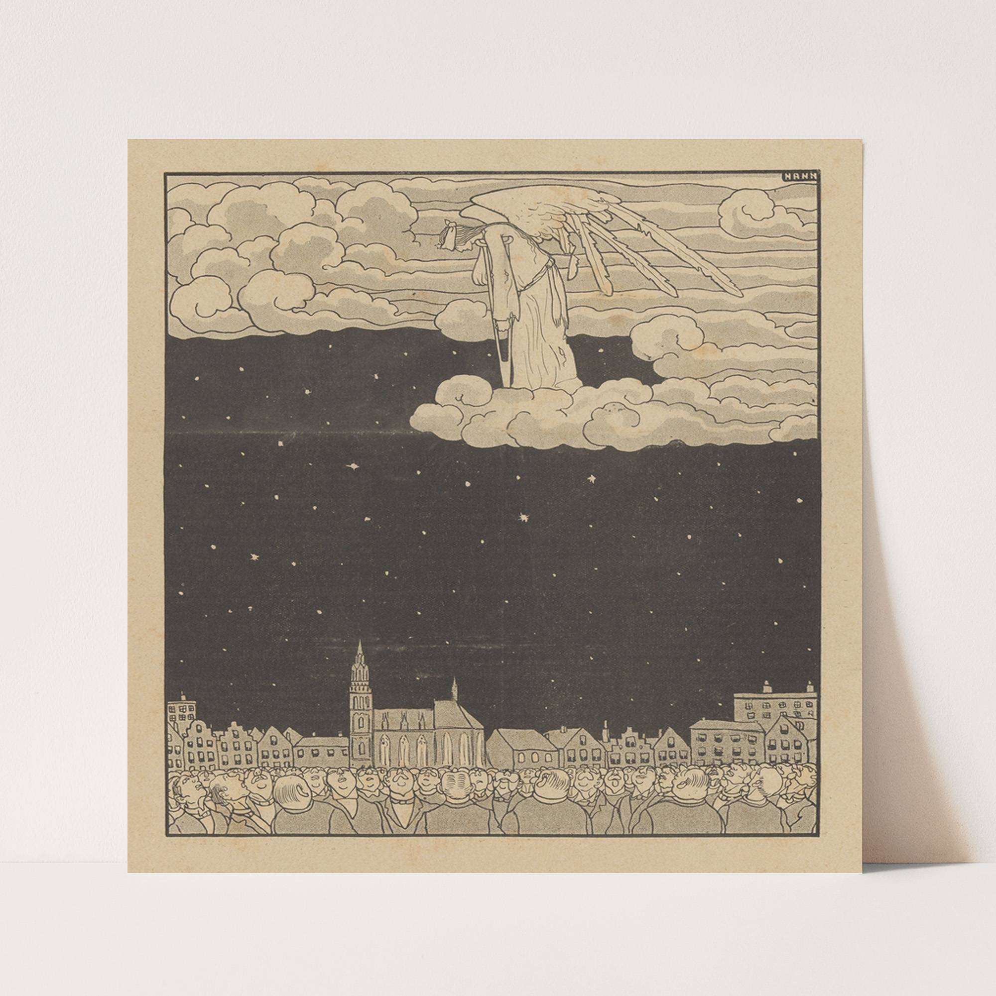 This art print, titled "Kerstnacht 1907" by Albert Hahn, features a beautifully detailed illustration of an angel descending from the sky over a cityscape. The angel, with flowing robes and large wings, is illustrated in a muted, sepia-tone palette, giving...