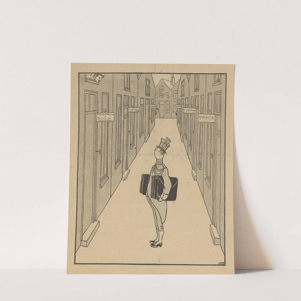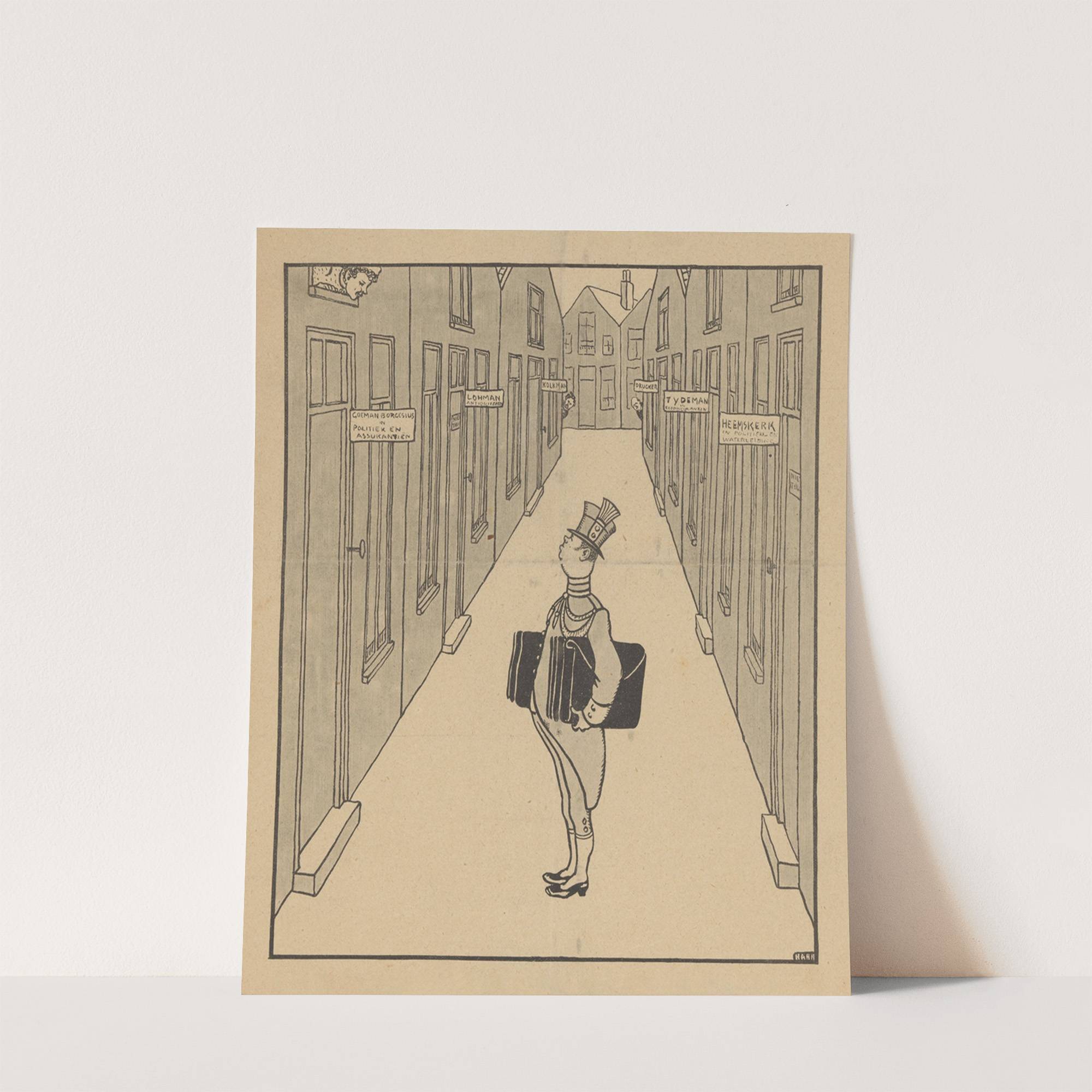 This print features a charming urban scene by De Notenkraker from February 1907, titled "In verlegenheid." The art showcases a narrow city alley lined with tall buildings on either side. These buildings are depicted in fine black lines, creating an...