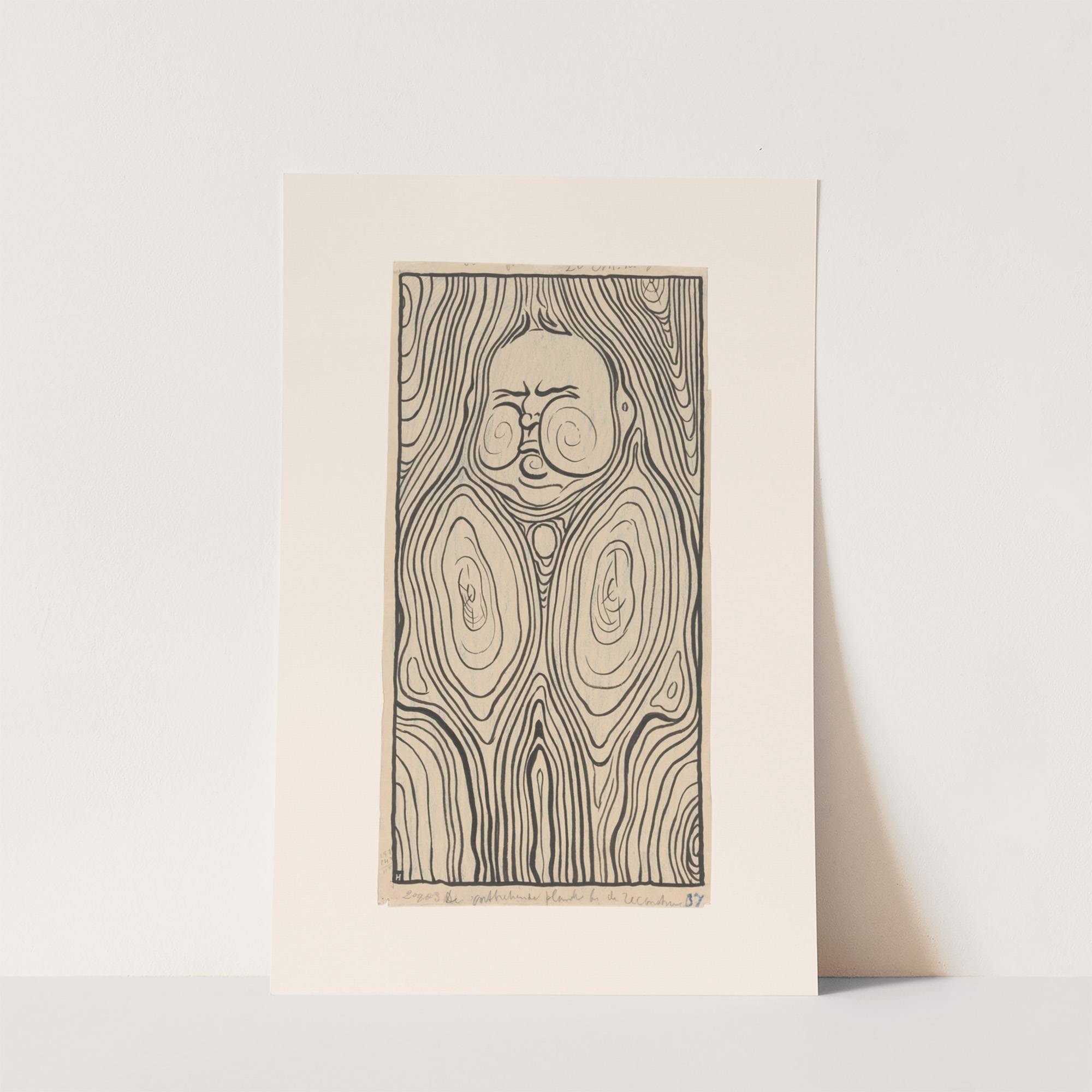 This striking artwork, "De ontbrekende plank" (The Missing Plank) by the renowned artist Albert Hahn, features an intriguing blend of natural wood grain patterns and a human face. Rendered in monochromatic tones with fine black lines on a white background,...