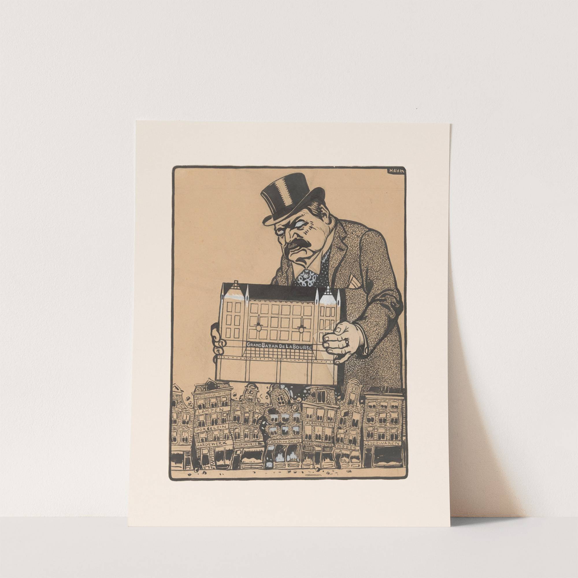 This print features "De Schnabel" by Albert Hahn, a classic example of political satire through caricature. The central figure is a towering man with exaggerated facial features, including a prominent mustache and brow furrowed in concentration. He dons a traditional...