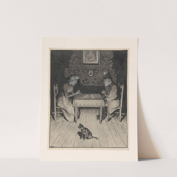 This striking black-and-white etching titled "De Voorspelling voor 1917" by Albert Hahn depicts an intriguing and enigmatic scene of two elderly men seated at a simple wooden table in a dimly lit room. Both men are dressed in long coats...