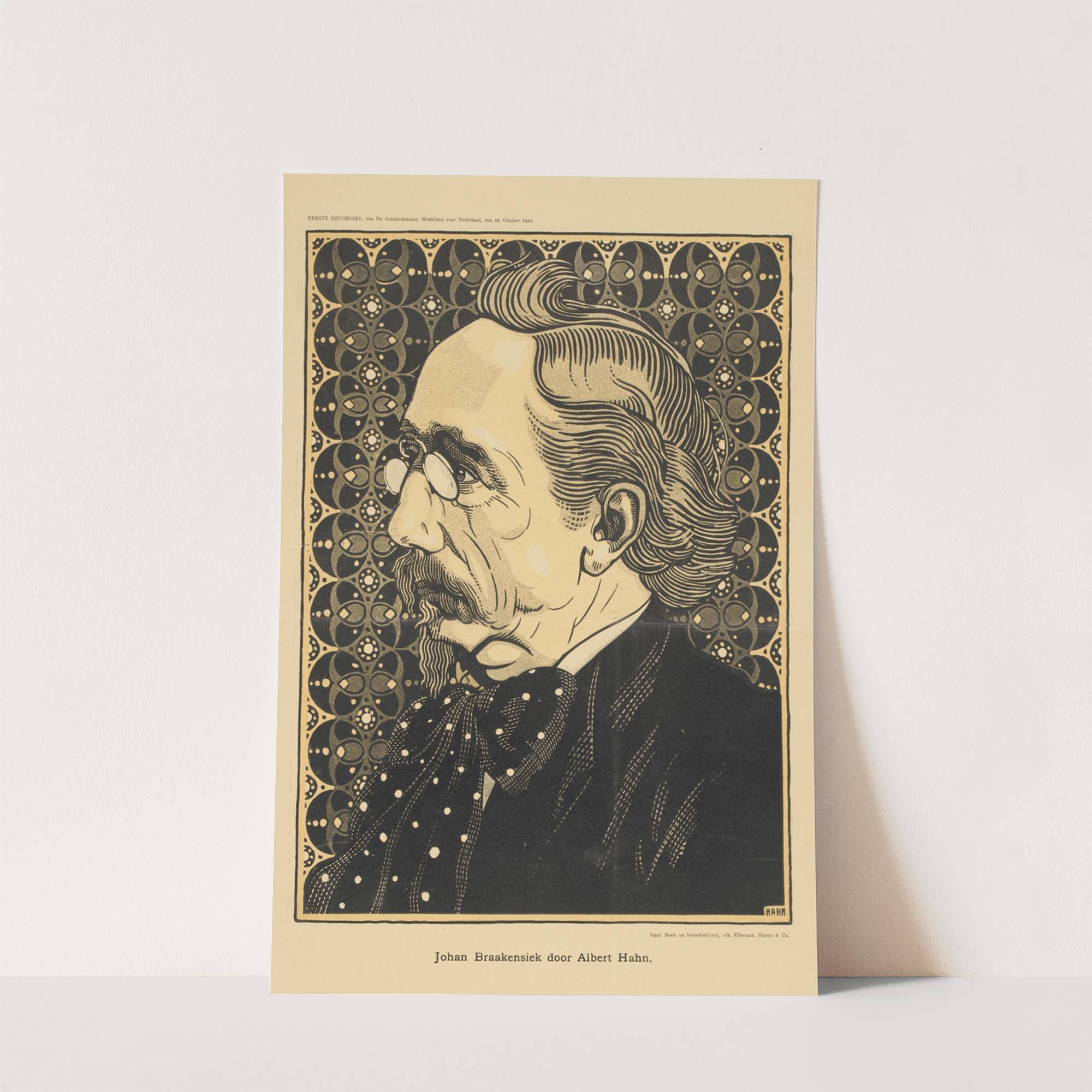 This artwork is a striking black-and-white print by artist Albert Hahn, titled "John Brahms in his Old Age." It features an intricately detailed portrait of the renowned composer John Brahms in profile view. The monochromatic palette creates a stark contrast...