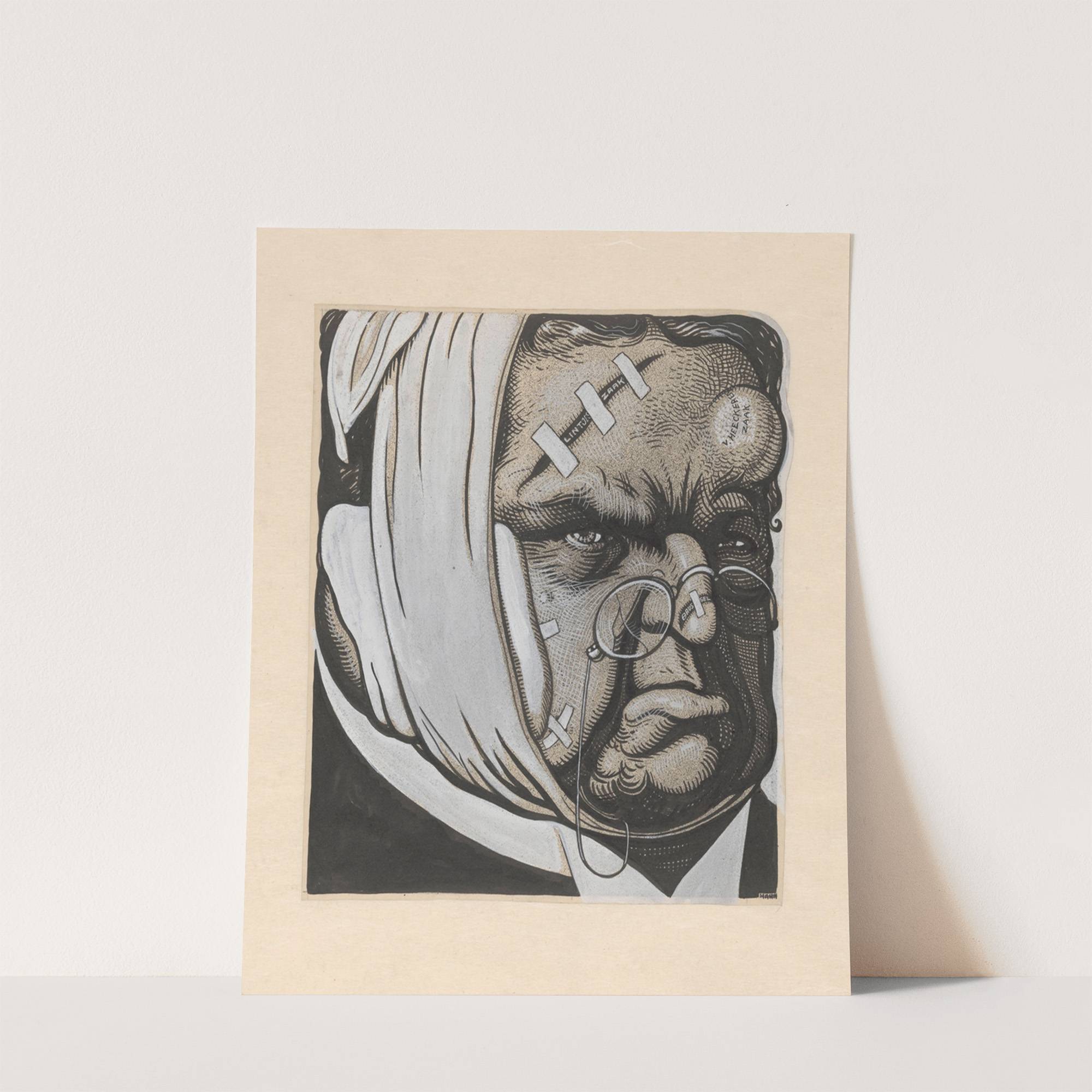 This striking art print features a hyper-realistic portrait of an elderly man with intense, weary eyes. The monochromatic palette of black, white, and shades of gray creates a stark contrast, emphasizing the depth and emotion in his expression. His face...