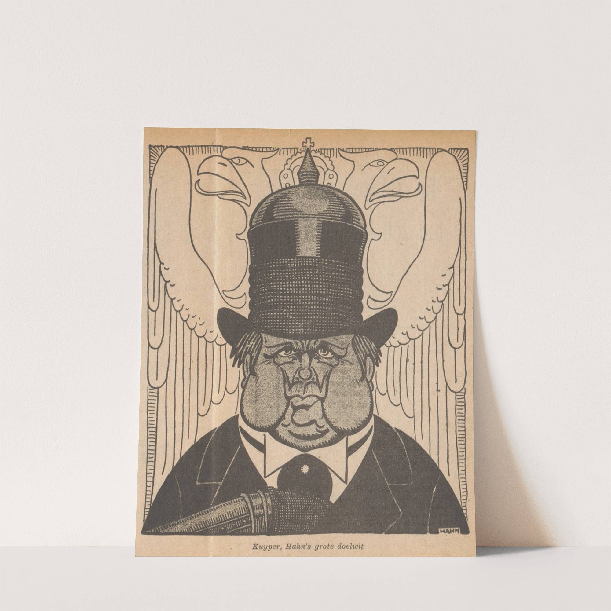 This striking print features "Hans' Grote Doelwit" by artist Kuyper in an intricately detailed style. The central figure is depicted with a somber expression, wearing a traditional Dutch hat adorned with a small cross at the top center. His face...