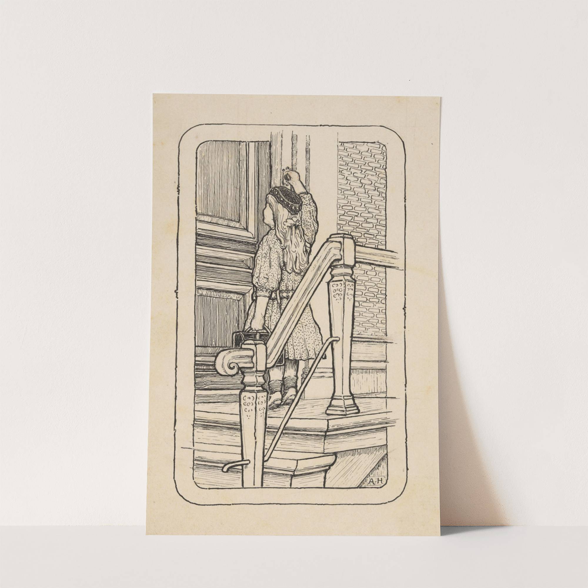 This black-and-white line drawing captures a moment of everyday life with intricate detail. The subject is an elderly person ascending a stone staircase, using a handrail for support. They are dressed in a long, patterned coat and boots that add...