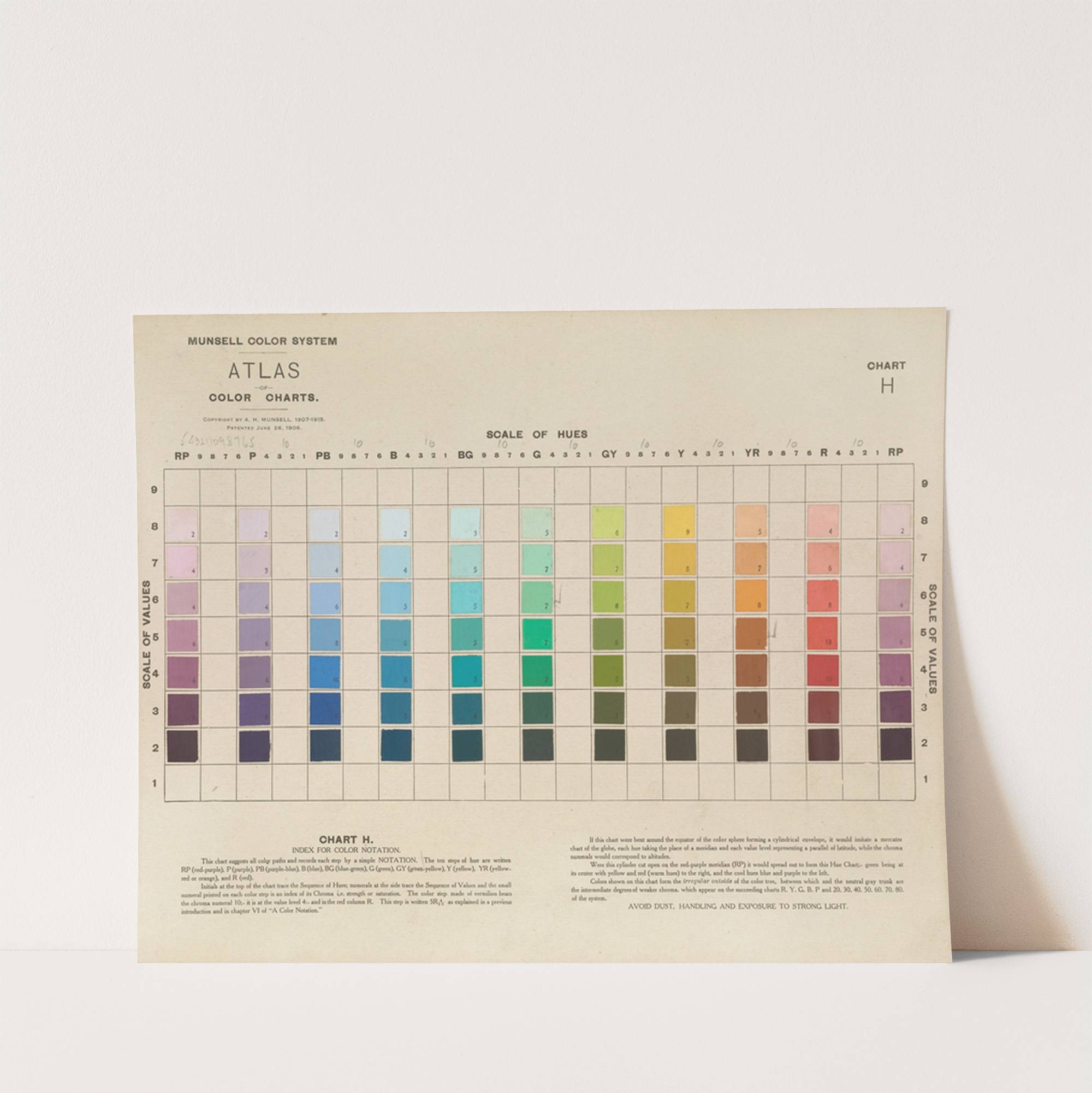 This artistic print features "Atlas of the Munsell Color System Pl.01" by Albert Henry Munsell. The grid layout showcases an extensive palette of over forty hues, meticulously organized from left to right and top to bottom in a rectangular format....