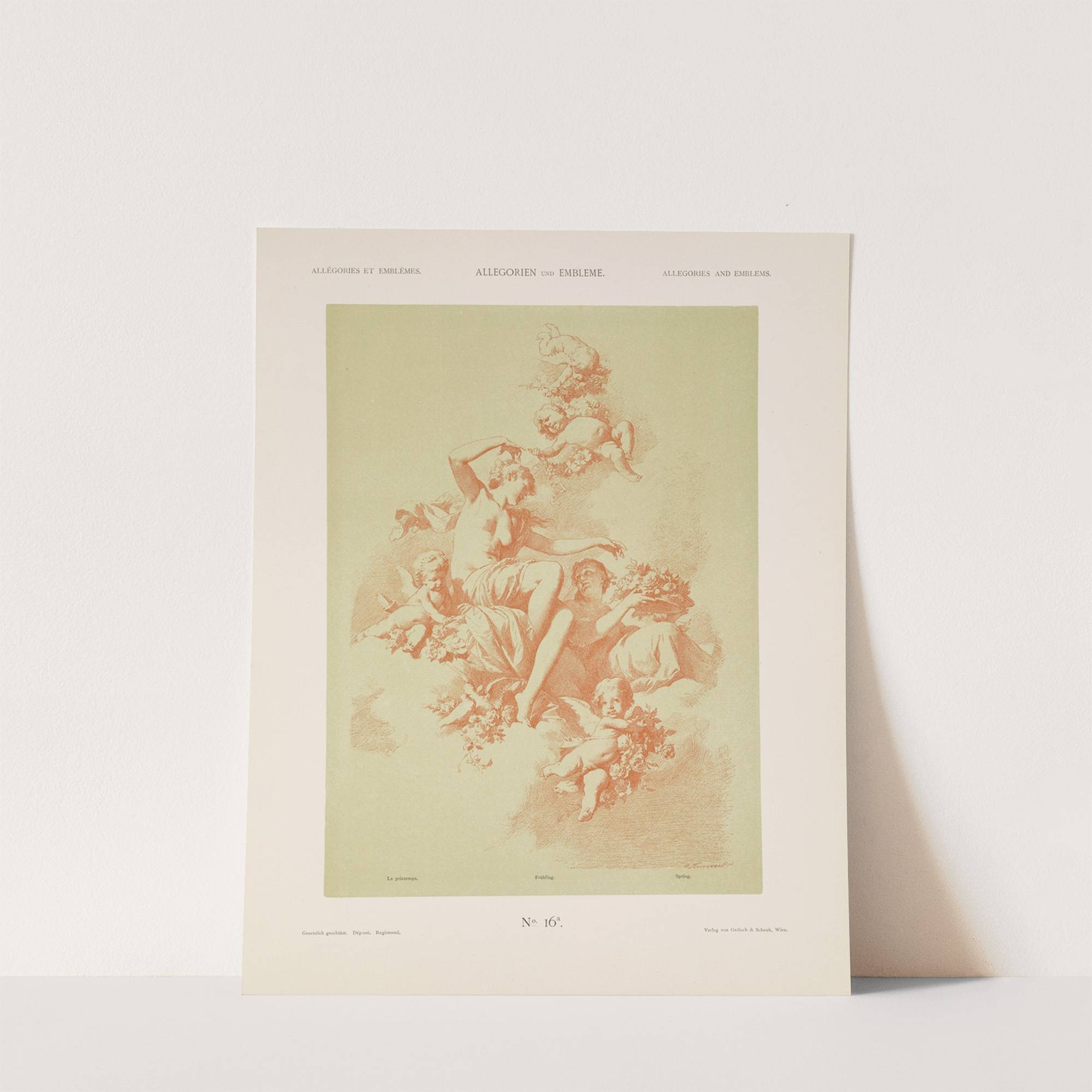 This exquisite art print, titled "Allegorien und Embleme Vol. I Pl.018" by Albert Ilg, is a masterpiece of classical allegorical art. Rendered in delicate sepia tones, the artwork features a serene and captivating composition of figures entwined with natural elements....