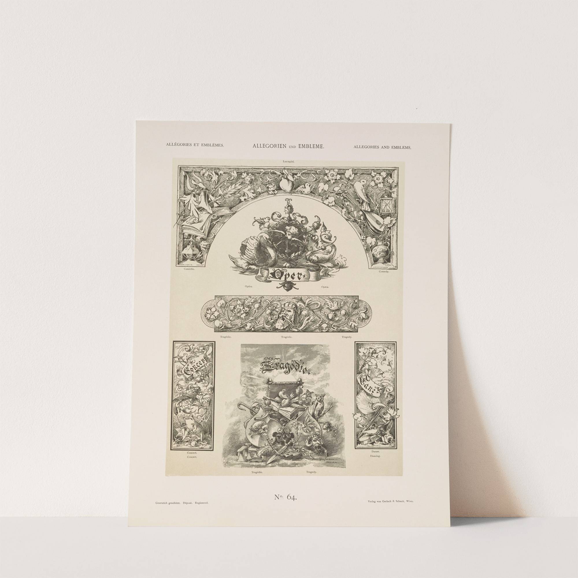 This elegant print showcases "Allegorie und Emblème Vol. I Pl.071" by the renowned artist Albert Ilg. The piece features intricate black and white illustrations set against a delicate, cream-colored background. At the top center, a detailed crest is prominently displayed...
